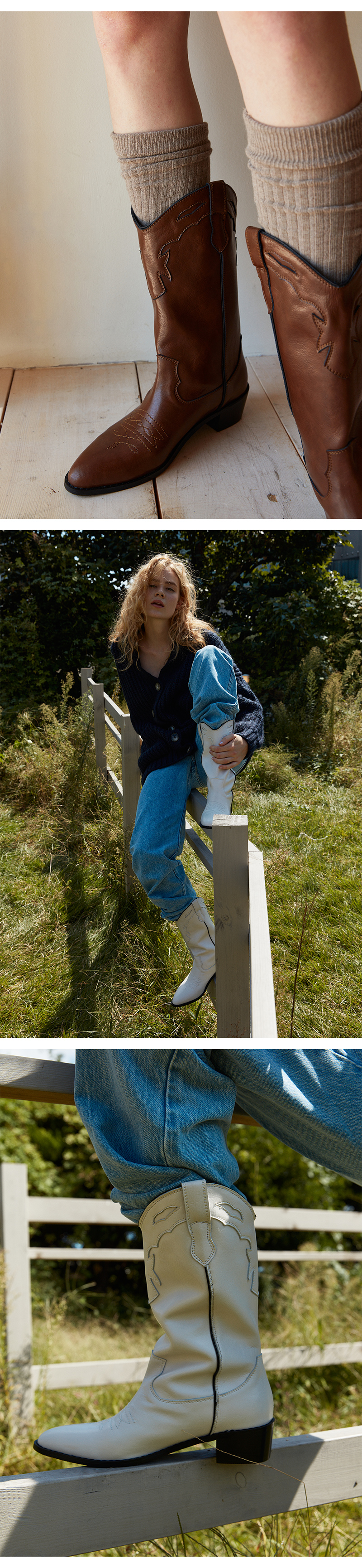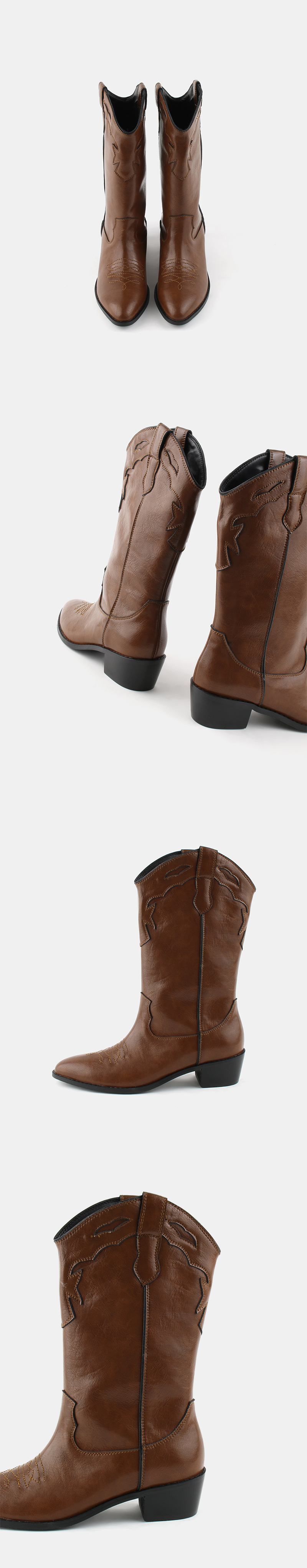 고전적인 웨스턴무드에서 영감을 받은 하프기장의 레더부츠, 감각적인 패치워크와 스티치 문양이 특징입니다.