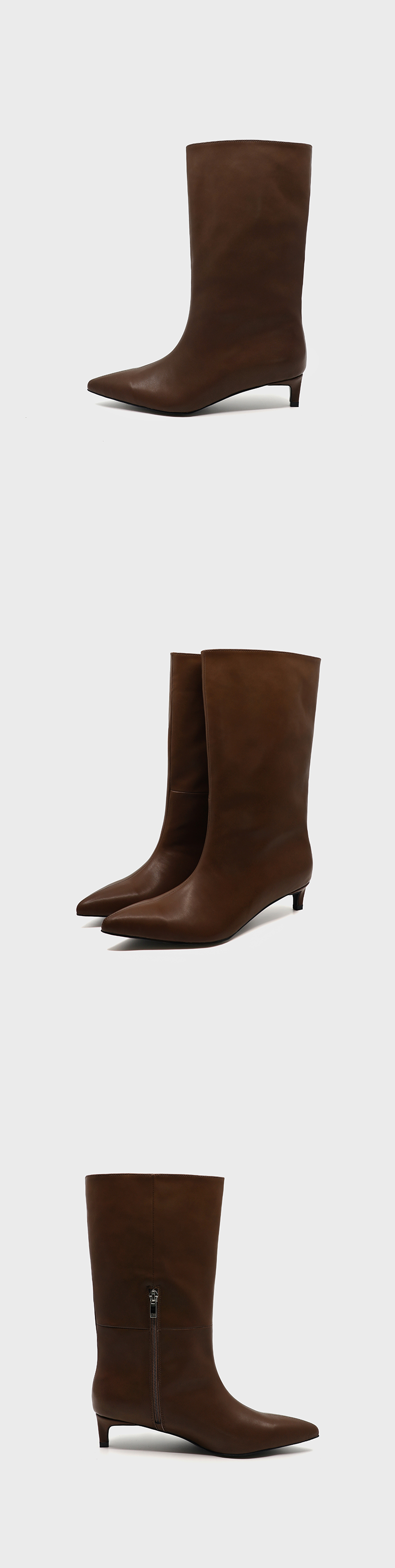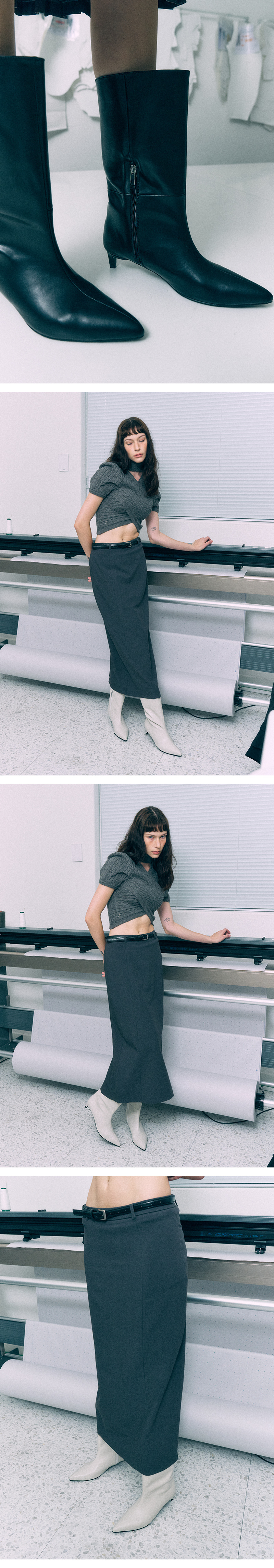 간결하고 스탠다드한 실루엣의 키튼힐 하프부츠, 와이드한 풀오버 스타일로 스커트, 팬츠 등 다양한 연출