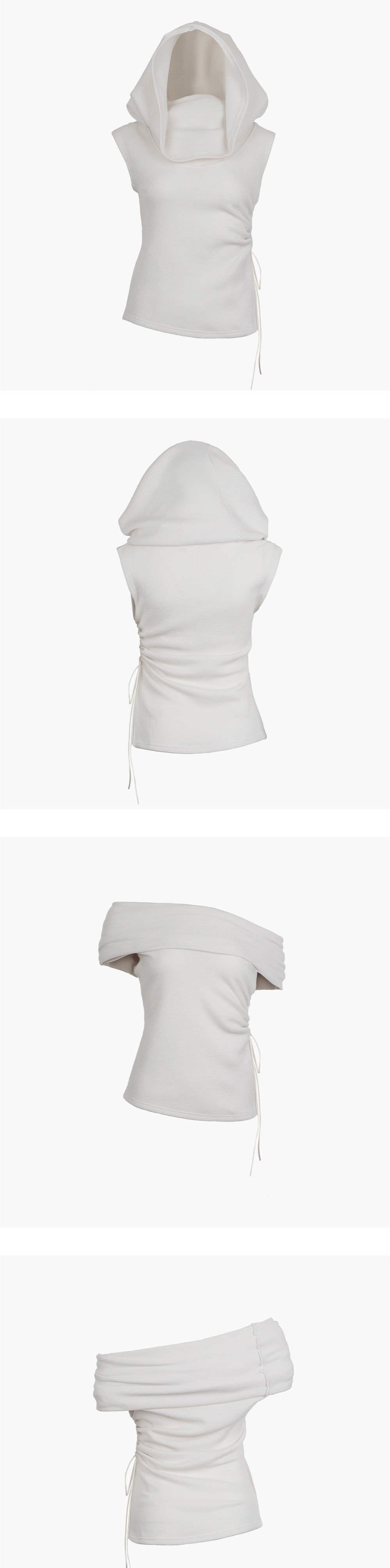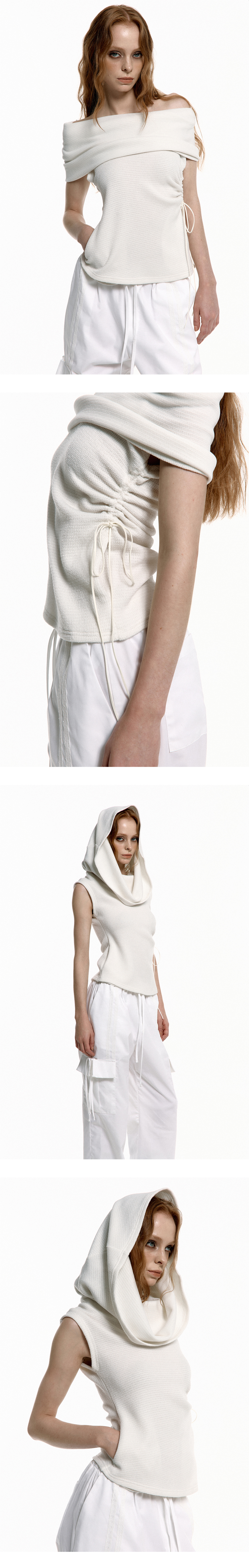 살짝 텍스처감이 있는 스판기 있는 니트 소재로 다양한 방식으로 연출이 가능합니다. 오프숄더로도, 후드로도 착용할 수 있으며, 후드를 내리면 목폴라 스타일로 변형이 가능합니다. 앞쪽에는 주머니가 있어 실용성을 더했고, 허리의 셔링 디테일을 조이고 풀어 다양한 실루엣을 연출할 수 있습니다. - Poly 95% Span 5% - Model Info : Suji 170cm 52kg - Fitting size : S