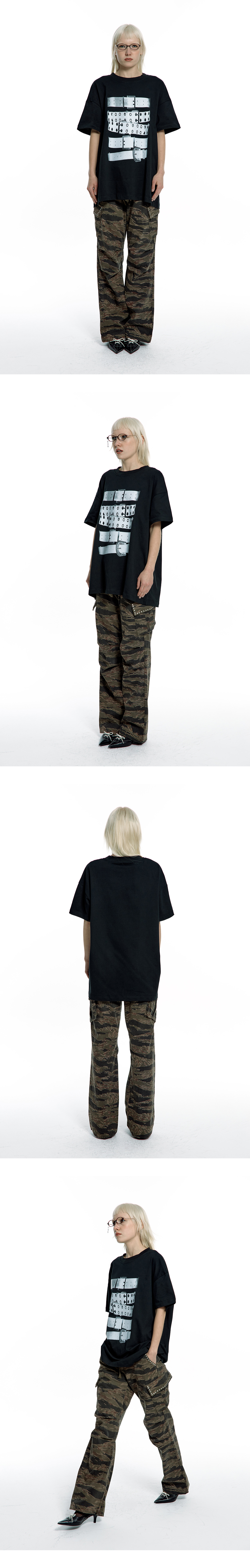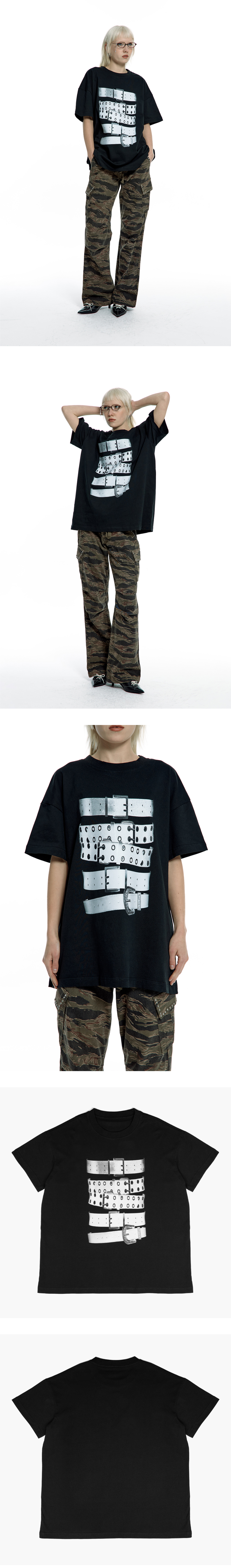 커다란 벨트 프린팅이 돋보이는 박시 핏 티셔츠입니다. 32수 쌍사 원단을 사용하여 도톰하고 튼튼한 퀄리티를 자랑하며, 여러 번 세탁해도 변형 없이 오래 입을 수 있습니다. 박시한 핏으로 디자인되어 누구나 편안하게 착용할 수 있으며, 짧은 팬츠나 스커트, 긴 기장의 하의와도 모두 잘 어울립니다. Model size : 165cm 48kg 착용사이즈 : FREE Material : Cotton 100%