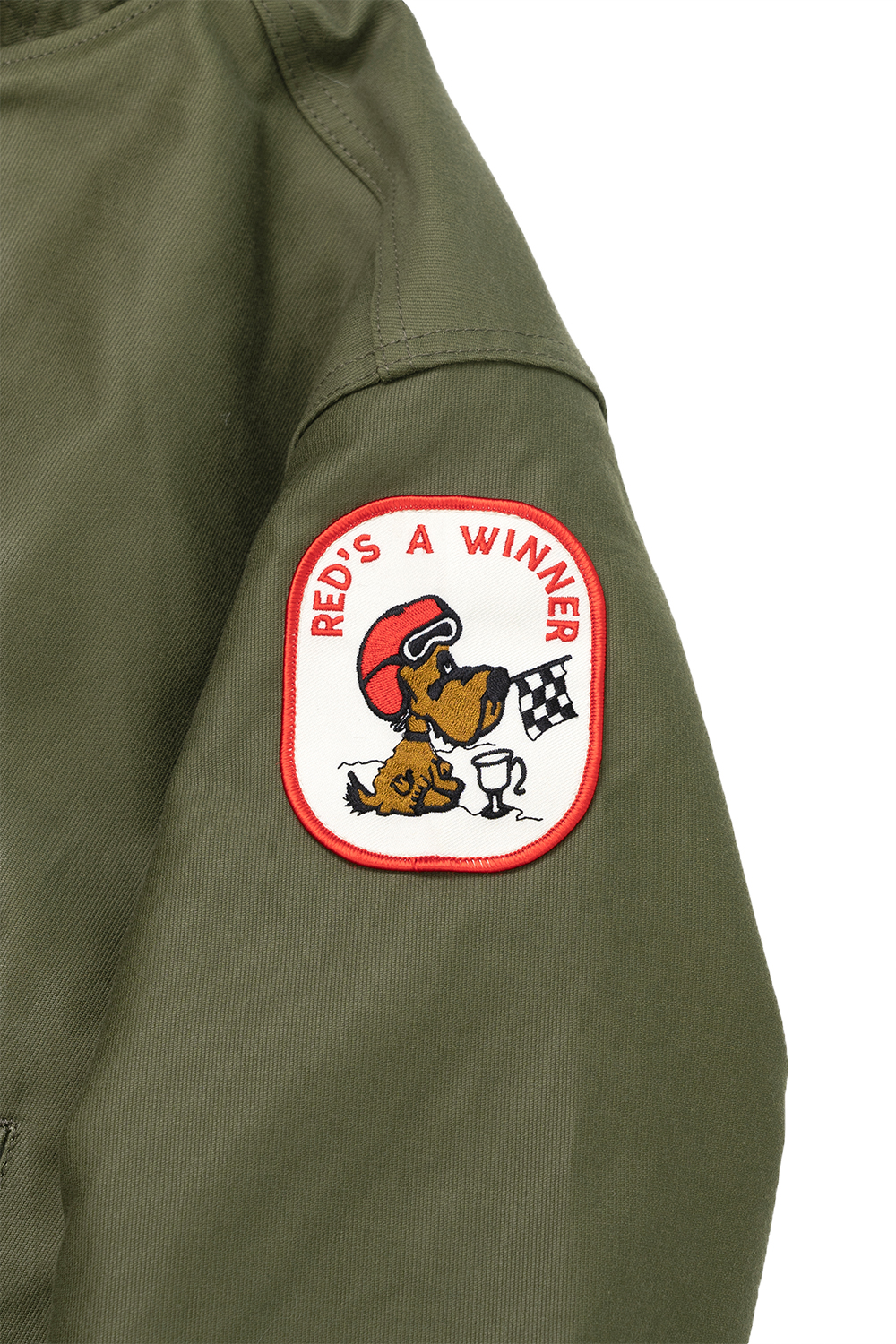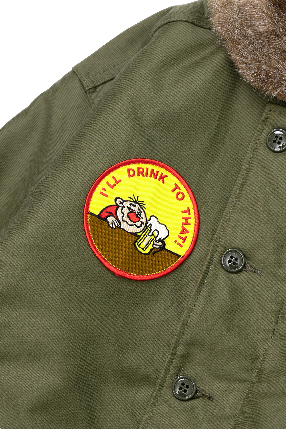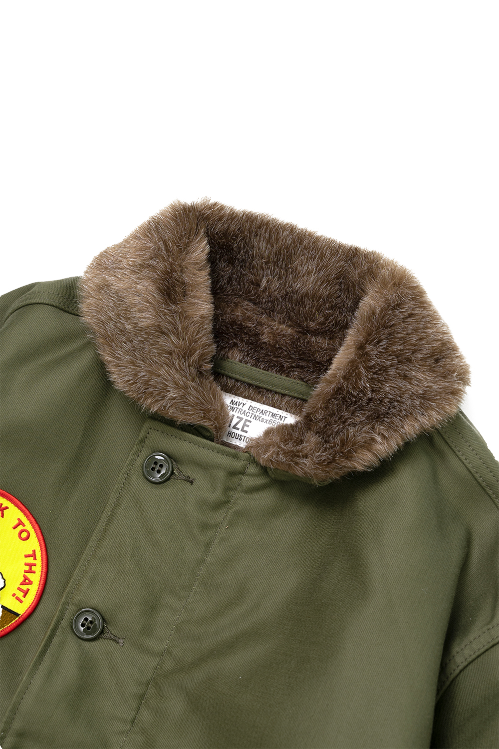 Houston Japan 51424 Custom N-1 Deck Jacket (Beer) - Olive Drab N-1 Deck Jacket의 커스텀 시리즈입니다. 두껍고 튼튼한 헤비 피케원단으로 제작된 덱자켓입니다. 안쪽 전면에 보아털이 붙어 있어 높은 보온성을 가지고 있습니다. 목부분은 N-1의 상징이기도한 보아털 카라이며, 카라 뒷면에 달린 버튼식 친스트랩으로 고정하면 보아가 목을 감싸 더 높은 보온을 유지할 수 있습니다. 전면은 IDEAL사(社)의 지퍼 위에 두껍고 튼튼한 플랩이 배치된 플라이프런트 형식입니다. 소매는 튜브리브 형식이며 겨드랑이 부분에는 환풍을 위한 4개의 벤틸레이션이 있고 안감에는 땀에 의한 손상을 방지하기 위해 별도의 천이 덧대어 있습니다. 왼쪽 가슴에는 USN 스텐실이 있고 손을 넣기 쉽도록 사선의 슬러시 포켓이 배치되었습니다. 밑단 부분에는 품을 조절할 수 있는 끈이 있습니다. 코믹한 2종류의 패치를 배치했습니다 착용시 42 사이즈가 105 사이즈 정도입니다.