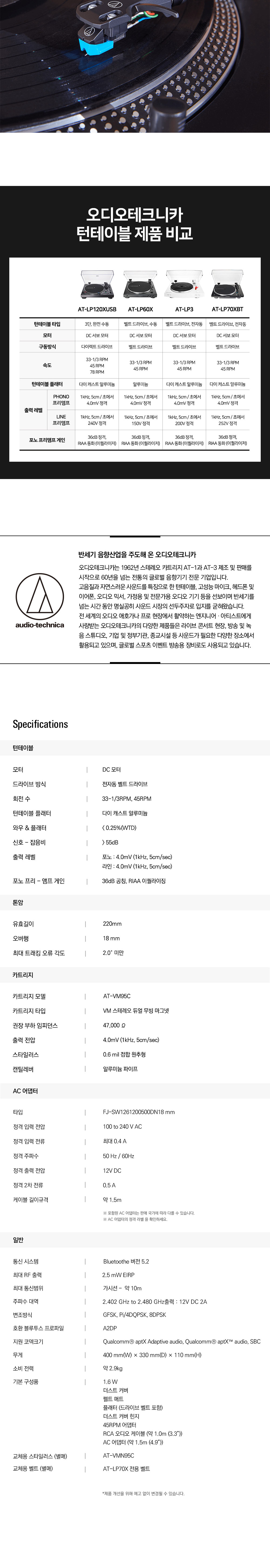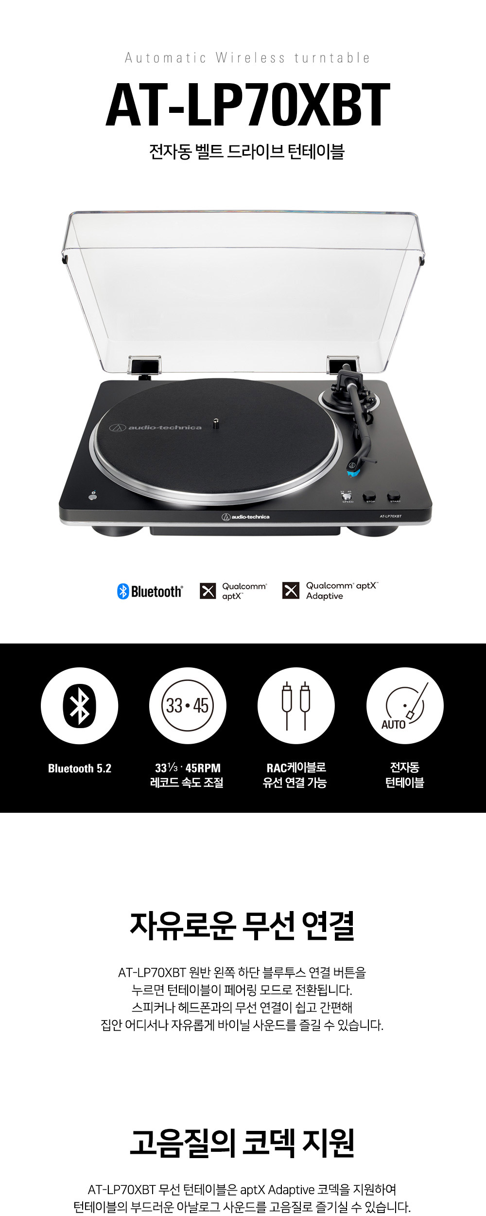 오디오테크니카 AT-LP70XBT 자동 벨트 드라이브 무선 블루투스 턴테이블 화이트 실버