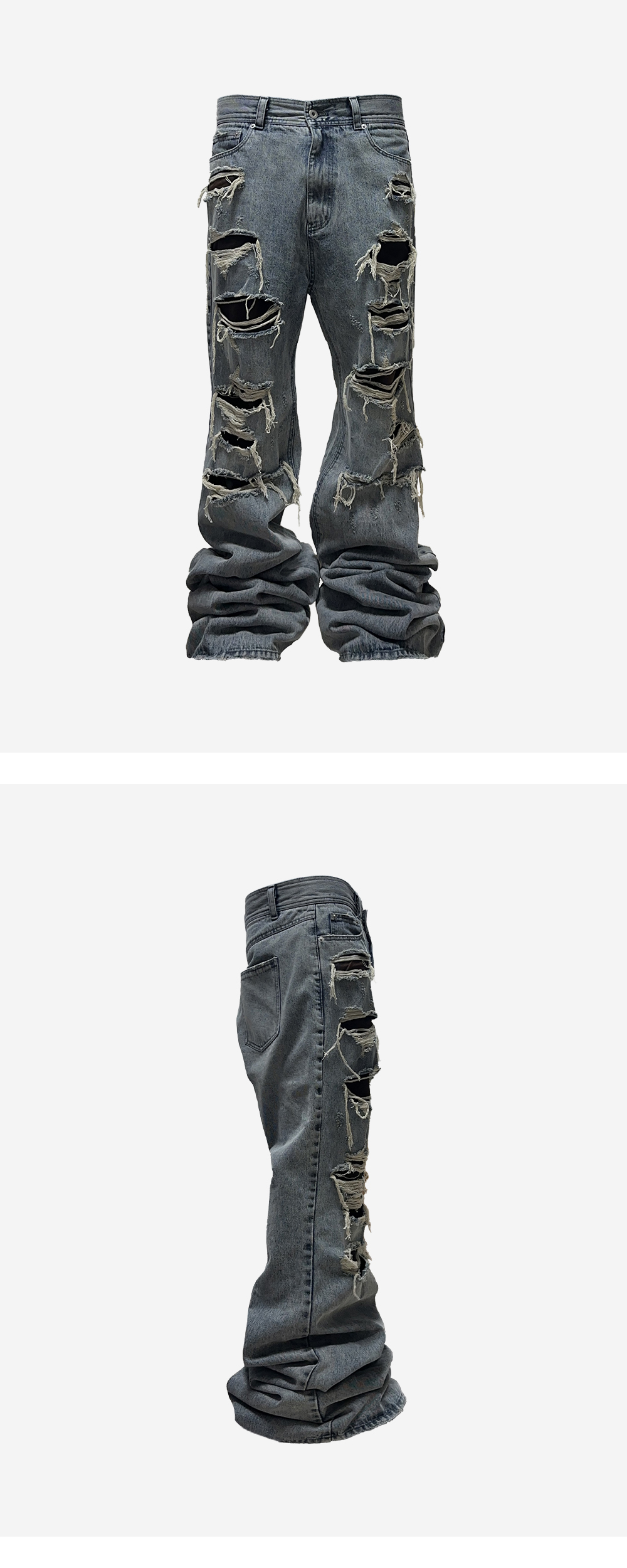 Distressed Flared Jean - Blue Cotton 100% Polyester 100% (linning) YKK Zipper YKK Rivet - 13oz 데님 패브릭 - 플레어 실루엣 - 디스 디테일 - 내부 전체 안감 - 밑단 내부 끌림 방지 밴드 (착화 전 밴드가 발등에 위치하게 착용) (해당 제품은 여러 워싱과 수작업 공정을 거친 제품입니다. 그리하여 개체별 원,부자재의 데미지나 워싱 등의 농도가 약간씩 상이할 수 있으며, 이는 자연스러운 현상으로 불량 사유에 해당하지 않는 점 참고 부탁드립니다.)