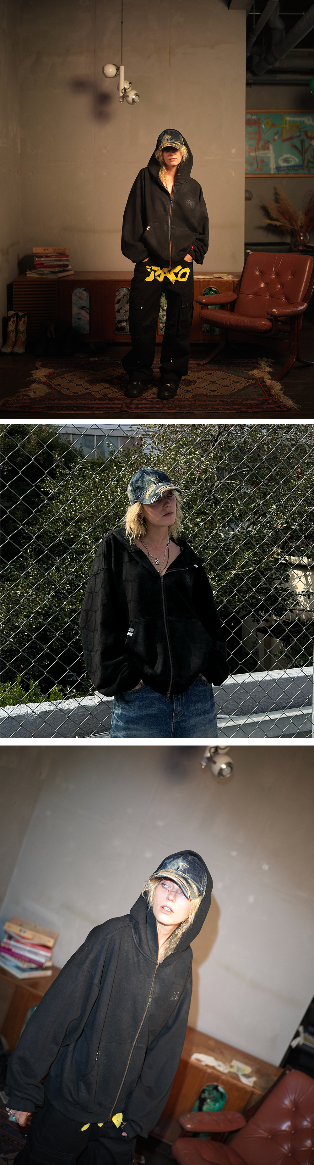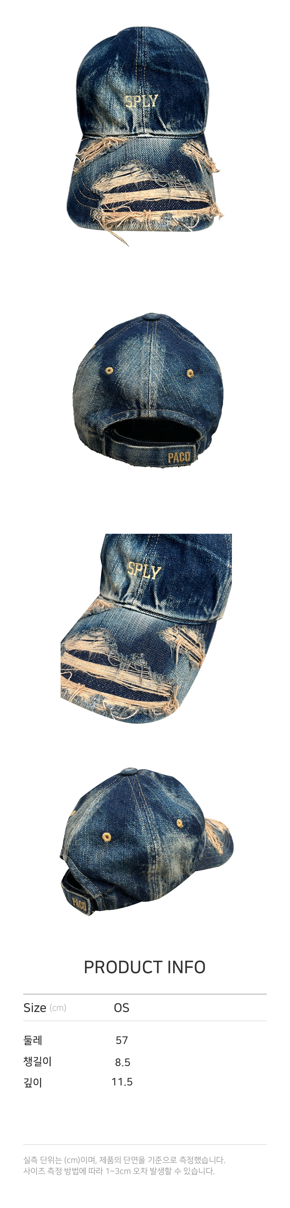 -데님 패브릭의 2겹 챙 그라인딩 데미지 워싱+염색 -후면부 메탈 조이게 장식 -프론트 SPLY 사틴 자수 -클래식 딥 볼캡 핏