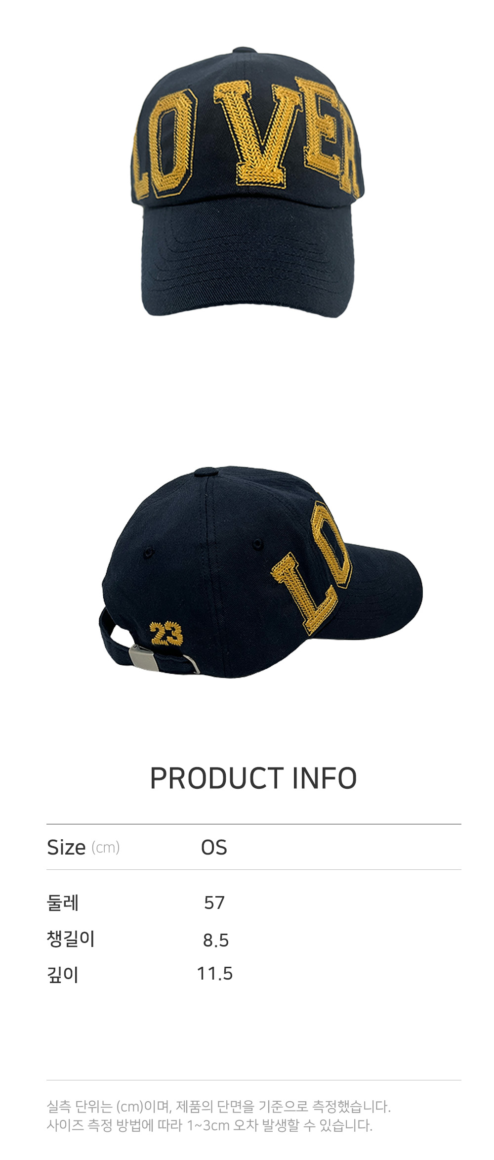 - 프론트 전면 체인 LOVER 자수 - 뒤측면 23 지그재그 스티치 - 후면부 메탈 조이게 장식 - 클래식 딥 볼캡 핏
