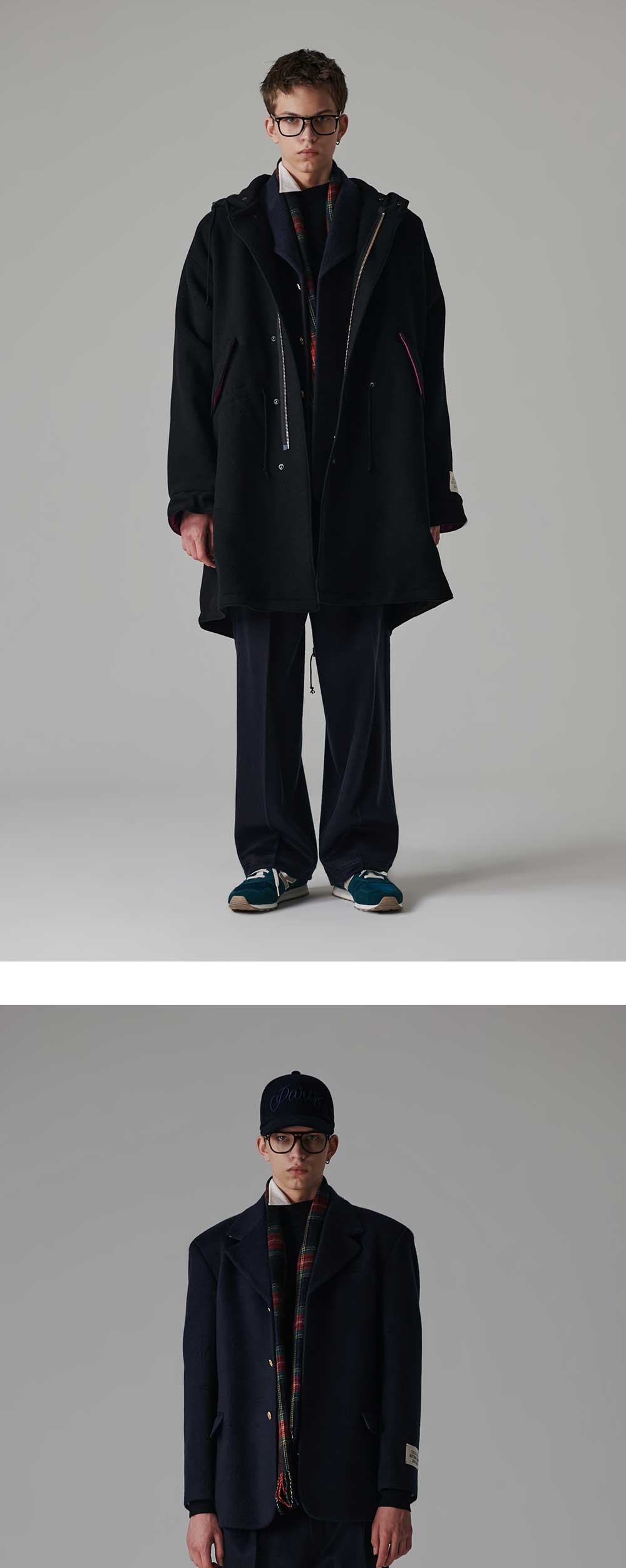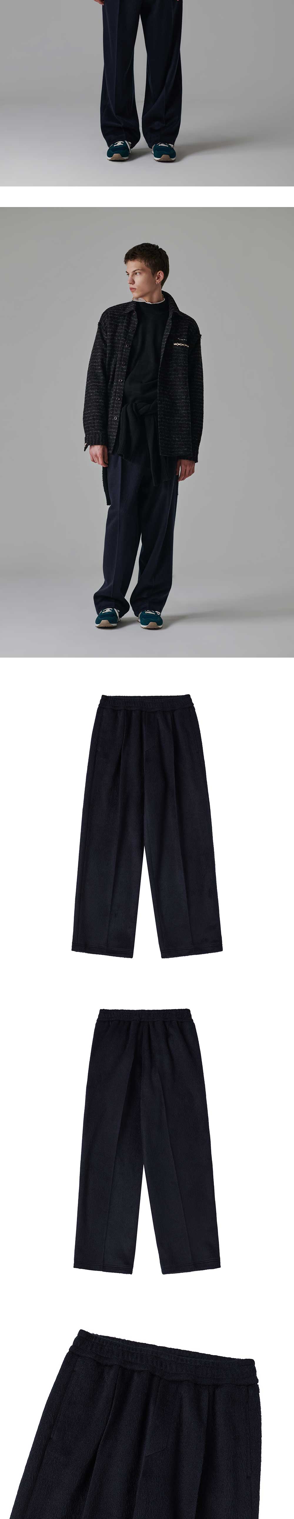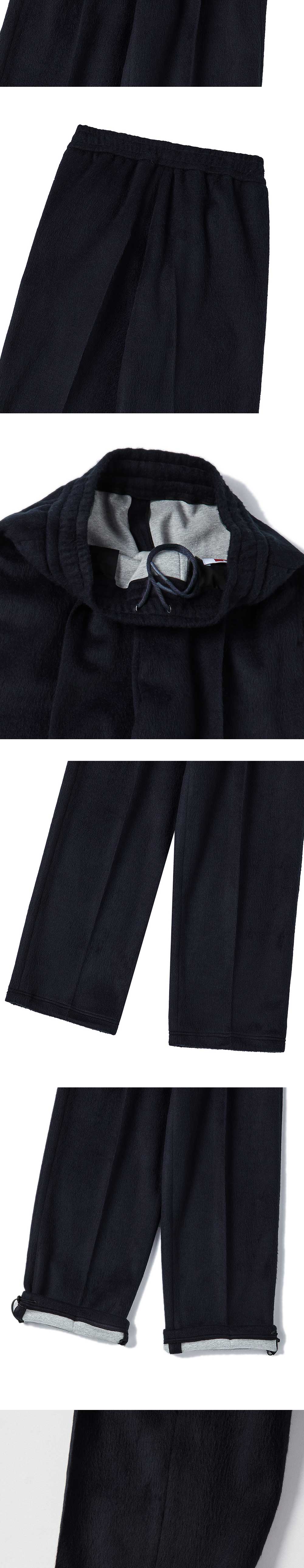 ㆍ일본산 울과 코튼 저지 소재를 합포한 유니크한 원단으로 제작 ㆍ트레이닝팬츠의 패턴에 수트 테일러링을 더한 디자인 ㆍ세미 와이드 핏으로 자연스러운 실루엣 연출 ㆍ허리 부분의 밴딩 처리와 스트링을 통해 사이즈 조절 가능 ㆍ밑단의 엘라스틱 스트링과 스토퍼를 통해 다양한 핏 연출 ㆍ네이비 컬러 자켓과 셋업 코디 추천 ㆍ안쪽 합포를 통해 편안함과 보온성 추가 ㆍ포켓의 안감은 코튼 소재 사용 ㆍ남녀공용 착용 ㆍ여성분들은 M사이즈 착용 권장