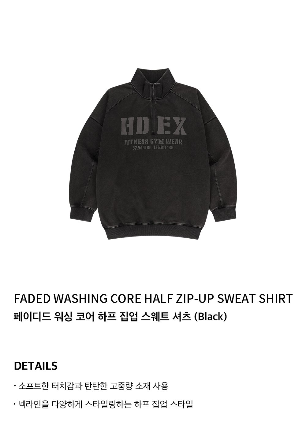 에이치덱스 페이디드 워싱 코어 하프 집업 스웨트 셔츠 블랙
