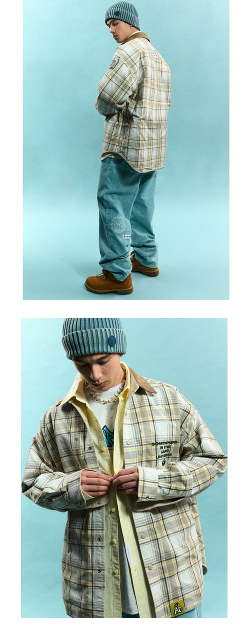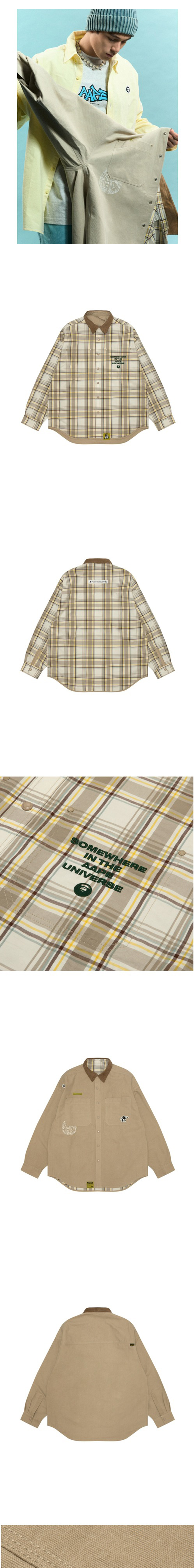 체크 셔츠와 캔버스 자켓 두 가지로 활용할 수 있는 베이직 아이템, 에이프의 리버시블 롱 슬리브 셔츠입니다. - 셔츠 자켓 디자인 - 오버한 실루엣으로 레이어드 용이 - 러버 택 및 로고 패치 디테일 - 로고 및 그래픽 자수 디테일 - 스냅 버튼 클로징 - 소매 스냅 버튼으로 실루엣 조절 가능