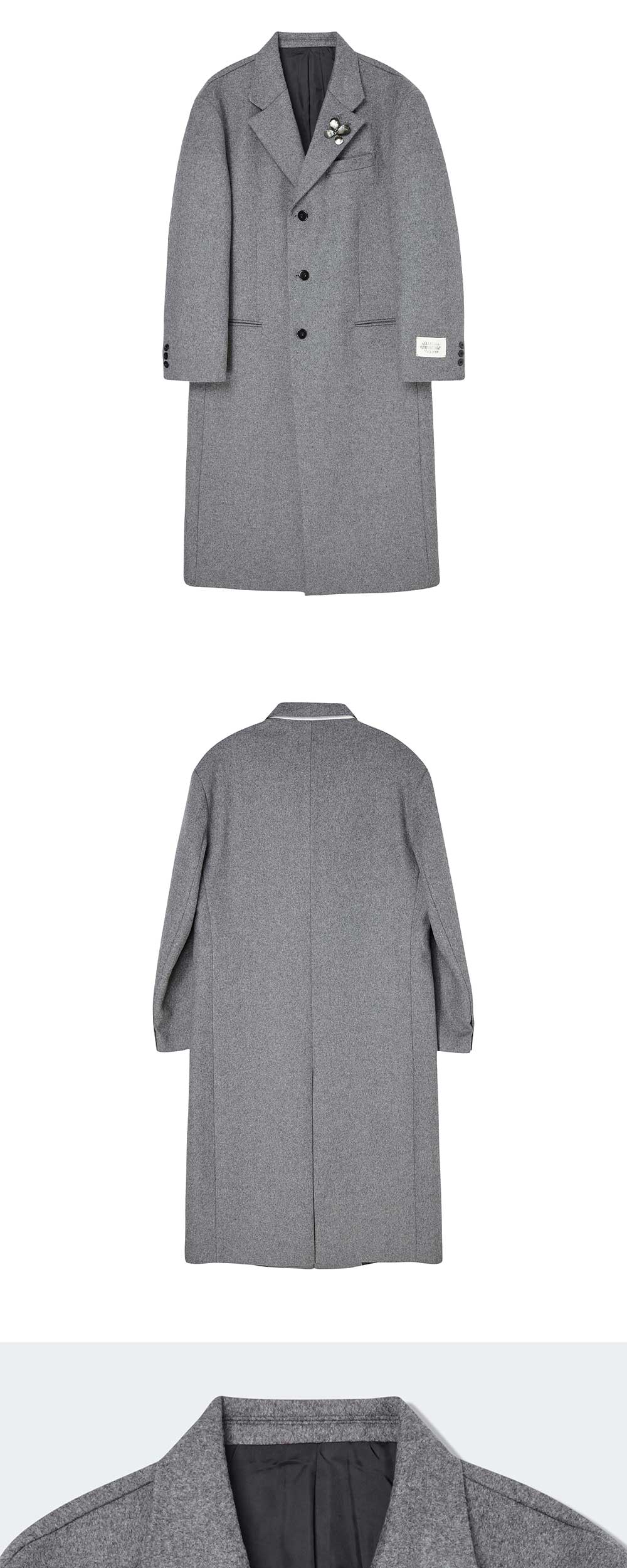 ㆍ슈퍼 파인 울 혼방 원단으로 제작 ㆍ세미 오버핏으로 여유로운 실루엣 연출 ㆍ맥시한 기장감으로 드라마틱한 핏 연출 ㆍ오리지널 테일러링으로 뛰어난 퀄리티와 내구성 ㆍ라펠 안쪽 플라워 홀 자수 디테일 ㆍ천연 흑자개로 제작된 버터플라이 브로치 옵션 ㆍ핸드메이드 메인 라벨 ㆍ남녀공용 착용 ㆍ여성분들은 M사이즈 착용 권장 ㆍ상품 및 모델착용 이미지 내 나비 브로치는 별도 구매가 필요한 상품입니다. -> [COLLECTION LINE] 블랙 셸 버터플라이 브로치