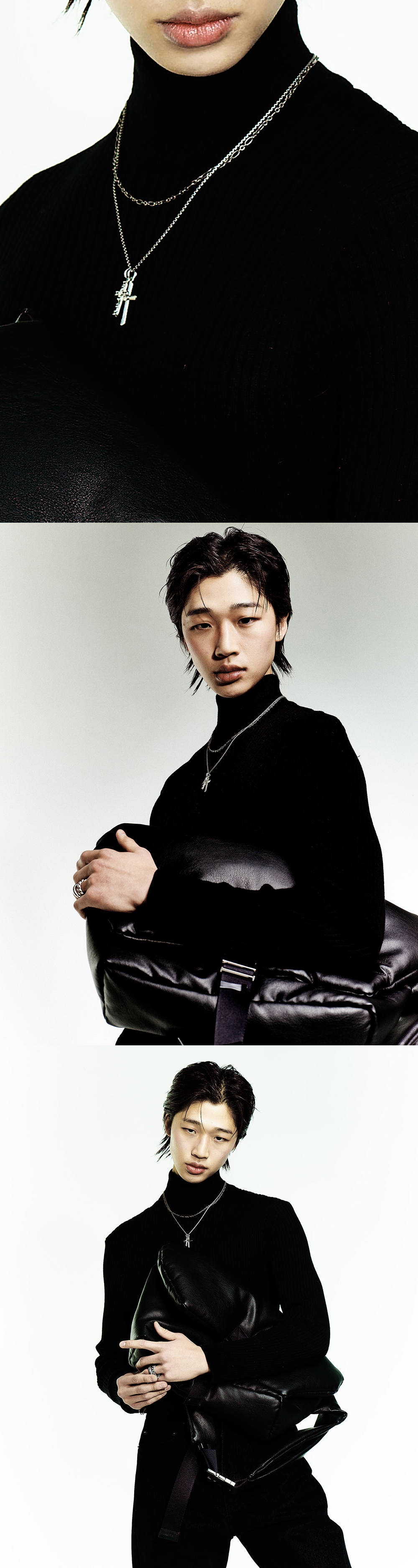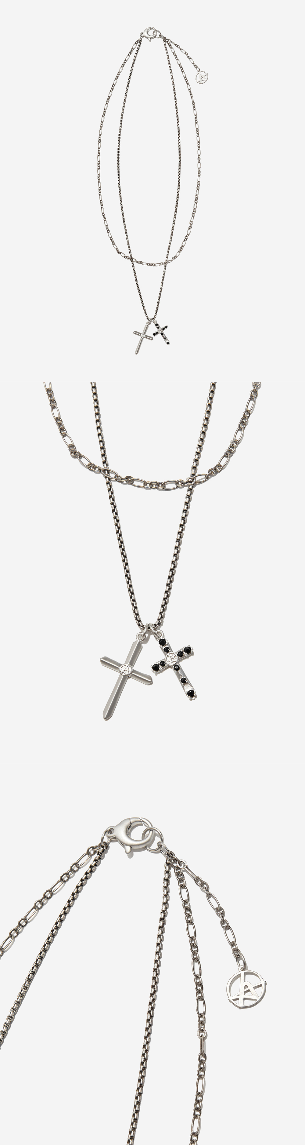 로고 심볼이 각인된 두개의 크로스 팬던트를 엮은 네크리스 입니다. 레이어드 형태의 체인으로 스타일리시하게 연출 하기 좋은 제품입니다. - _x0008_DEATIL - 십자가 형태의 로고 팬던트 레어이드 체인