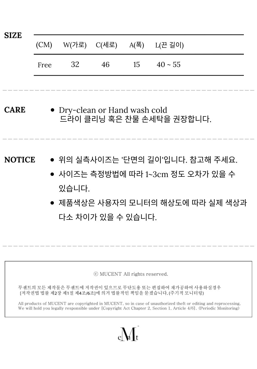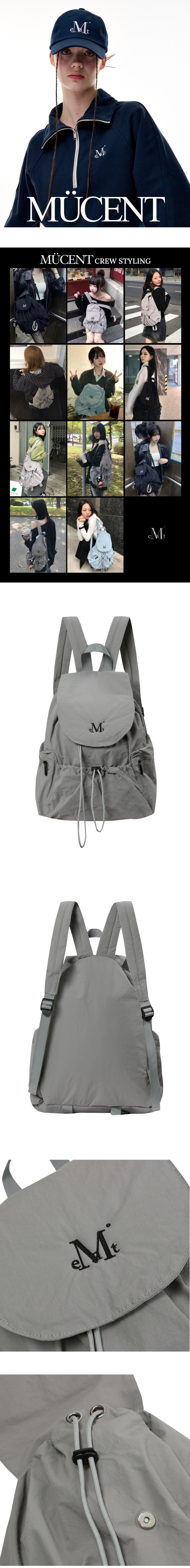 ┃Detail • 무센트 시그니처 로고 자수 포인트 • 폴리에스터 소재로 가볍고 편안한 착용감 • 자석, 스트링 이중 여밈 방식으로 안전한 수납 • 앞면 스트링 여밈 포켓 • 양 사이드 지퍼 여밈 포켓 • 내부 포켓으로 높은 수납 활용도 • 데일리 하게 착용 가능한 색감 ┃Material : Polyester 100% ┃Care : Dry cleaning - 무센트는 말기의 행성인 이 지구에서 지속 가능한 옷들을 고민합니다. 우리는 신념을 소비하는 미닝아웃을 지지합니다.