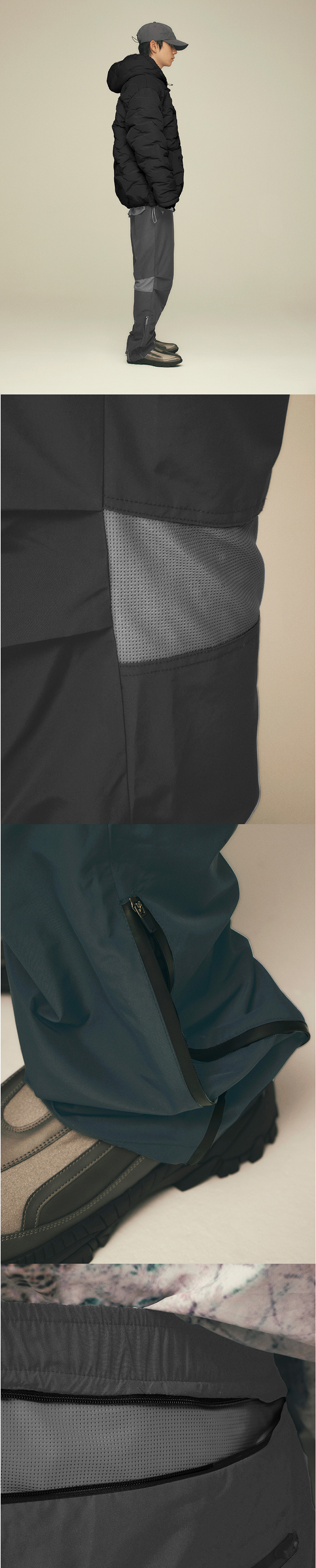 Detail - Polyester 100% - Waterproof Zip detail - Zipper detail at back for vetntilaion - Double dart knee - Adjustable fit - Mesh panel at back - 기능성 폴리에스테르 원단 - 방수지퍼 디테일 (주머니, 밑단) - 통풍을 위한 뒷부분 지퍼 디테일 - 무릎에 이중 다트 - 밑단 핏 조절 가능 - 무릎 뒤쪽에 메시 디테일. Polyester 100% Made in South Korea Washing Information Machine wash cold With like colours Do not bleach
