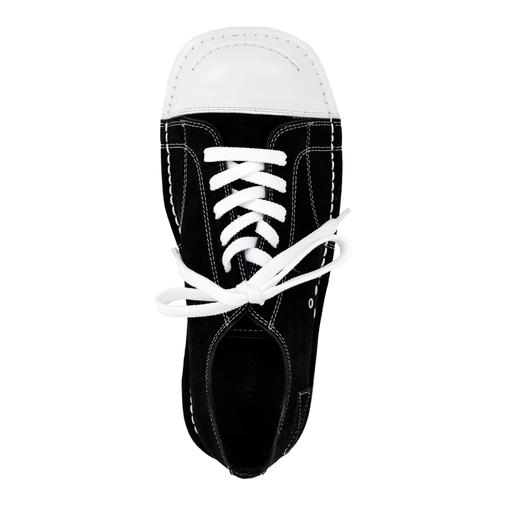 밑창이 닳은 스니커즈를 신던 커트 코베인의 노래를 들으며 제작했습니다. 와이드한 쉐입의 WIDE-02 fit을 기반으로 만든 아웃스티치 기법, 둥그런 앞코 디자인, 빈티지한 패치워크, 3홀의 조합은 장난스러운 소년의 모습을 떠올리게 합니다. *소재 - Body : cow suede & cow leather - Bottom : EVA *사이즈 - wide-02 fit - 와이드 팬츠에 어울리는 빅 볼륨 (굽높이 3.5cm) - 사이즈 추천▼ (확인 필수!!!) 평소 신으시는 신발의 가장 작은 사이즈 대비 발볼/발등 넓고 높으시면 -10사이즈 발볼/발등 좁고 낮으시면 -15사이즈 다운(최대-20) (다운사이징하셔도 보통 작지 않습니다) *주문 제작 상품으로, 제작 기간은 결제 후 영업일 기준 약 12일 소요됩니다. *제품상자는 자사의 제품임으로 훼손시 환불이 불가합니다.
