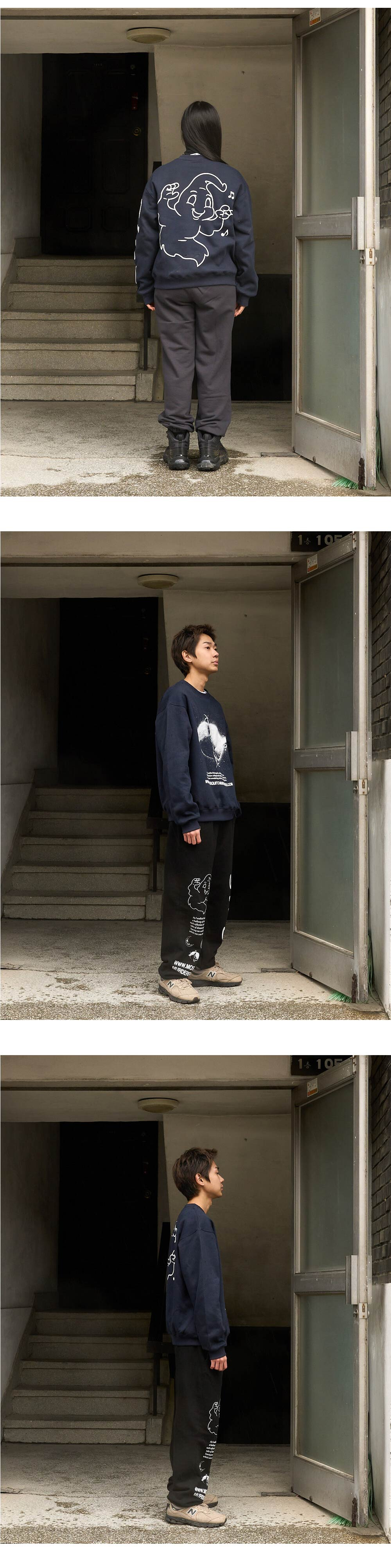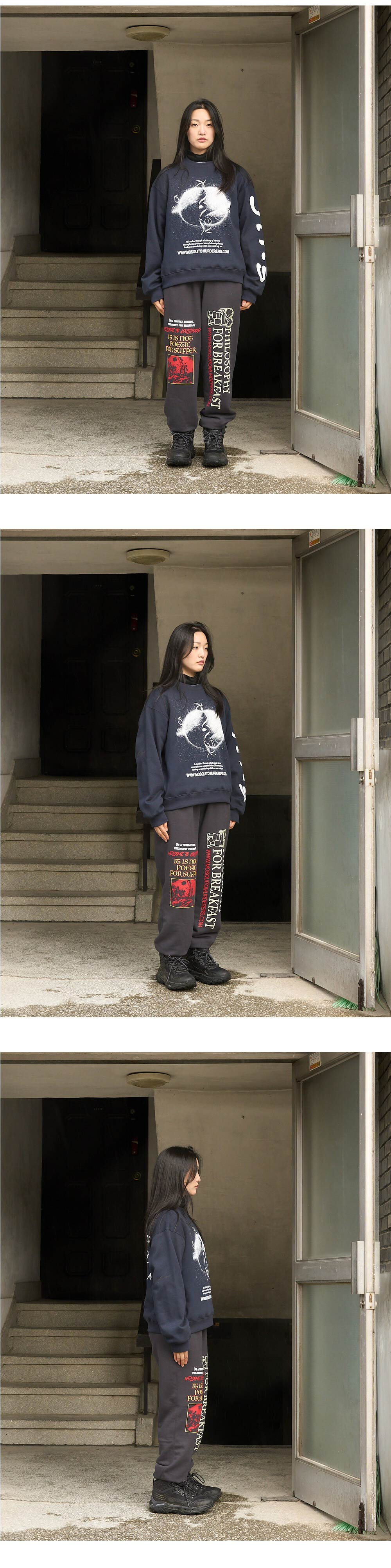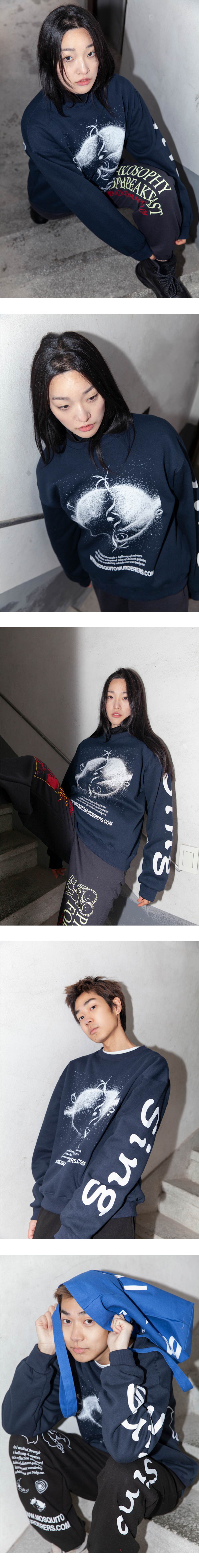 170cm(5’6”) / 59kg(130lb) WEARS SIZE 1 178cm(5’8”) / 55kg(121lb) WEARS SIZE 2 - Cotton 80% Polyester 20% 기모원단으로 도톰하고 소프트한 텍스처 - 목 늘어남을 방지하기 위한 넥라인 해리처리 - 갈라삼봉 봉제법으로 내구성이 우수하며 완성도 높은 실루엣 - 넓고 두꺼운 밴딩을 이용한 소매 및 끝단 시보리 처리 - 덤블워싱, 텐타 가공을 거쳐 오랜시간 착용 및 세탁시에도 옷의 변형을 최소화 - 벗겨지거나 바래지 않는 선명한 프린팅 Mosquito murderers의 모든 의류는 한땀 한땀 사람의 손으로 탄생됩니다. 세탁시 케어라벨을 확인해 주시고, 프린팅의 손상을 최소화 하기 위해 옷을 뒤집어 세탁하는 것을 권장합니다.