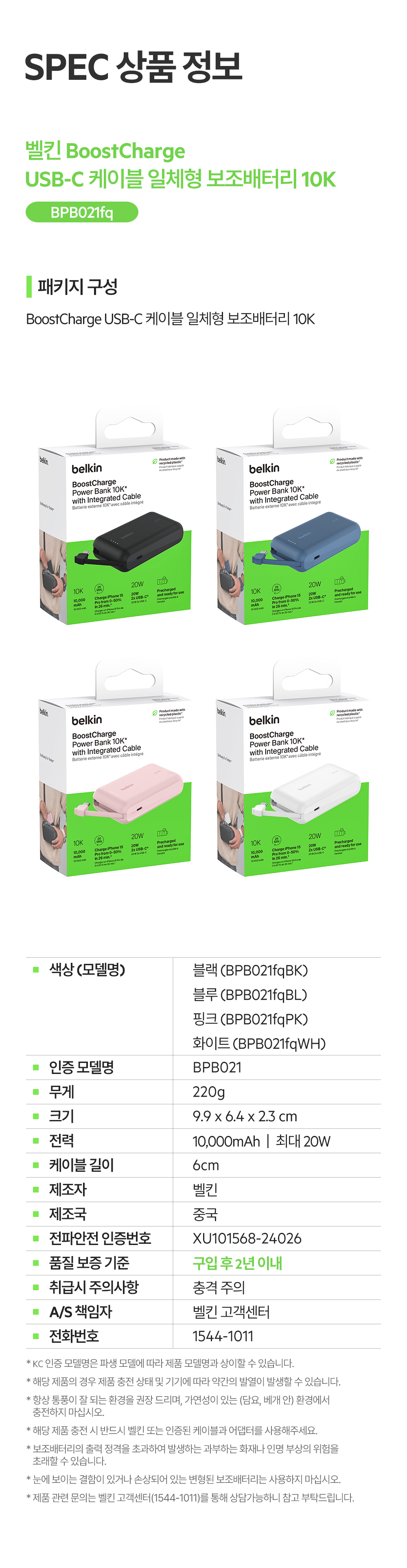 벨킨 C타입 케이블 일체형 20W 10000mAh 보조배터리 BPB021fq 블루