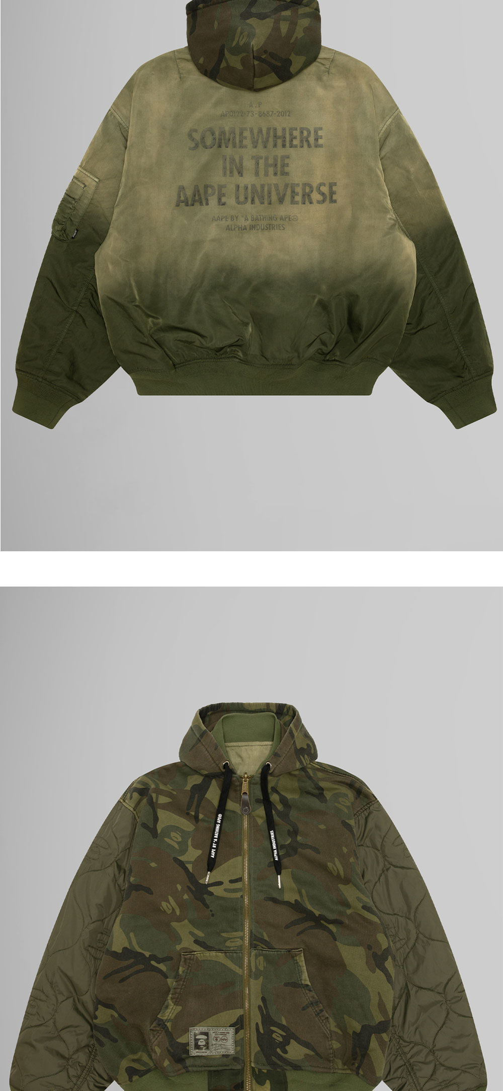 한쪽에는 워싱 효과, 다른 쪽에는 스프레이 염색 기법이 적용된 리버시블 자켓입니다. - 드로우스트링 후드 디자인 - 문페이스 로고 디테일 - 리버시블 디자인 (워싱, 스프레이 염색 기법 적용) - AAPE 소매 리본 디테일