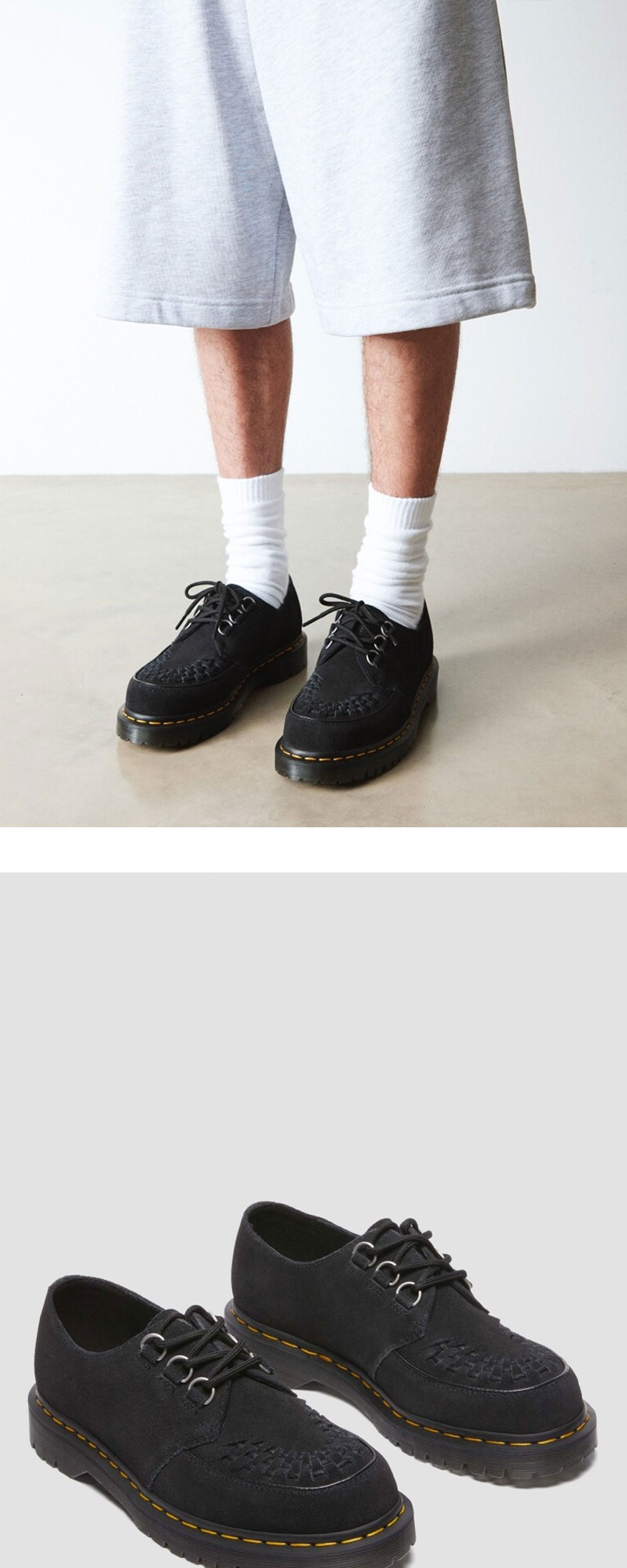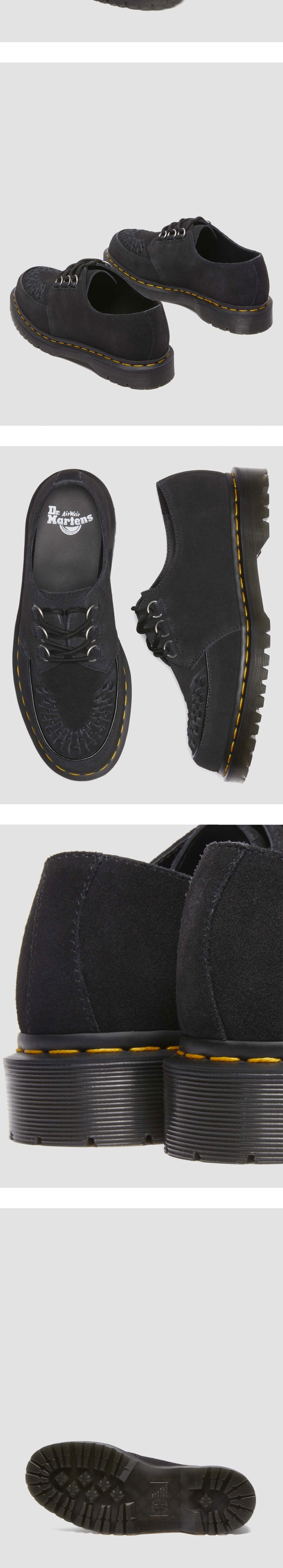 스웨이드 재질의 가죽이 매력적인 닥터마틴의 램지 스웨이드 크리퍼 블랙입니다. - 부드러운 E.H. 스웨이드 - 클래식한 3홀 슈즈 디자인 * E.H 스웨이드는 부드러운 촉감을 가진 클래식 가죽입니다.