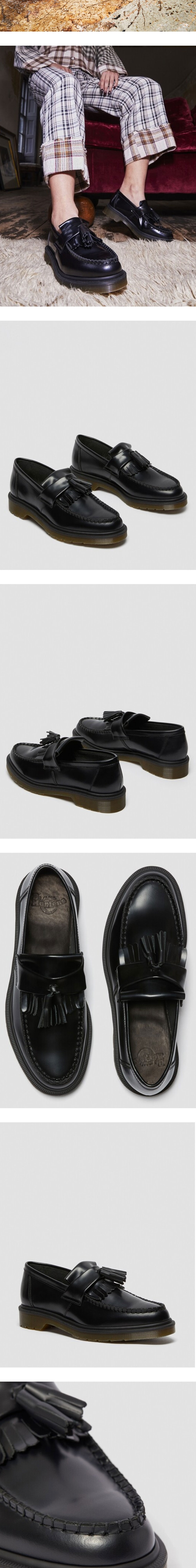 클래식한 디자인에 태슬 포인트가 매력적인 닥터마틴의 아드리안 스무스 태슬 로퍼 블랙입니다. - 편안한 에어 쿠션 밑창 - 매끄러운 블랙 폴리싱 가죽
