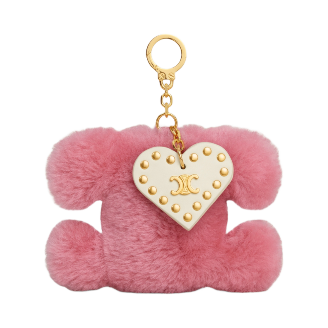 Celine Triomphe Pom-Pom Keyring with Heart in Shearling and Calfskin with Gold Finishing Pink