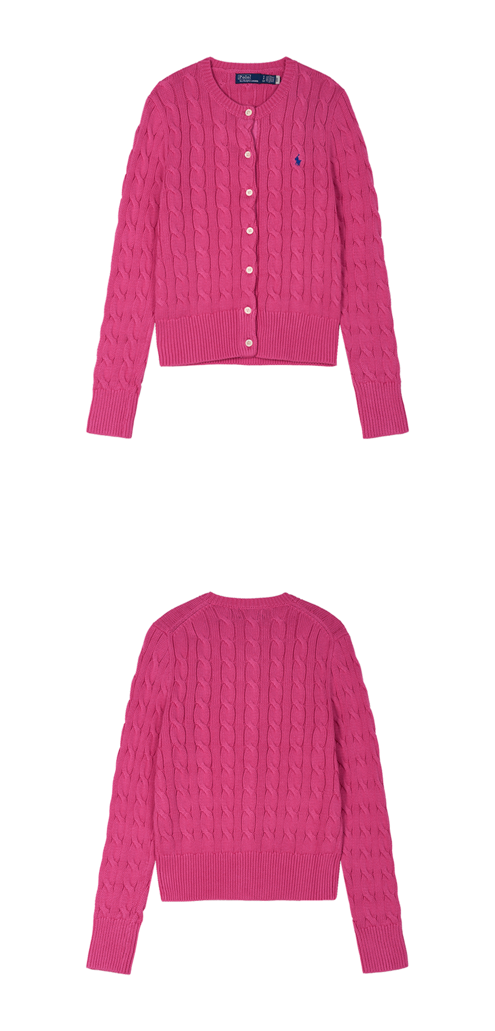 < KREAM은 랄프로렌 코리아 공식 파트너사로 모든 상품은 랄프로렌 코리아(유)에서 공급받은 정식 수입 제품입니다 > 순면 케이블 니트 소재의 슬림한 크루넥 카디건으로, 체스트에 시그니처 포니 자수로 마무리된 폴로 랄프 로렌의 우먼 케이블 니트 코튼 크루넥 가디건 핑크 - 25SS입니다. - 슬림핏 - rib-knit crew neck & hem & cuffs - 버튼 플라켓 - 좌측 가슴에 시그니처 포니 자수