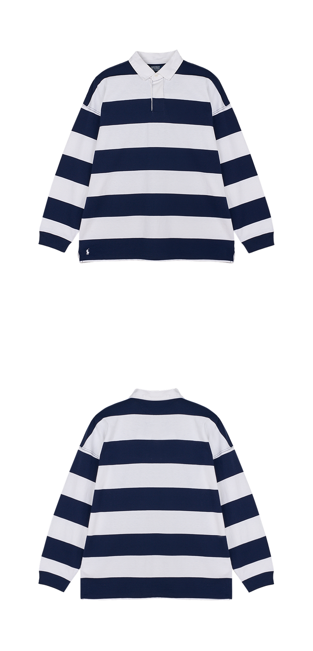 < KREAM은 랄프로렌 코리아 공식 파트너사로 모든 상품은 랄프로렌 코리아(유)에서 공급받은 정식 수입 제품입니다 > 1990년대의 아이코닉한 빅핏이 특징인 폴로 랄프 로렌의 빅 핏 스트라이프 저지 럭비 셔츠 화이트 뉴포트 네이비 - 25FW입니다. - 오버사이즈 핏 - 트윌 럭비 칼라 & 3 버튼 플라켓 디자인 - ribbed cuff - 밑단 슬릿 디테일 - 오른쪽 밑단 시그니처 포니 자수