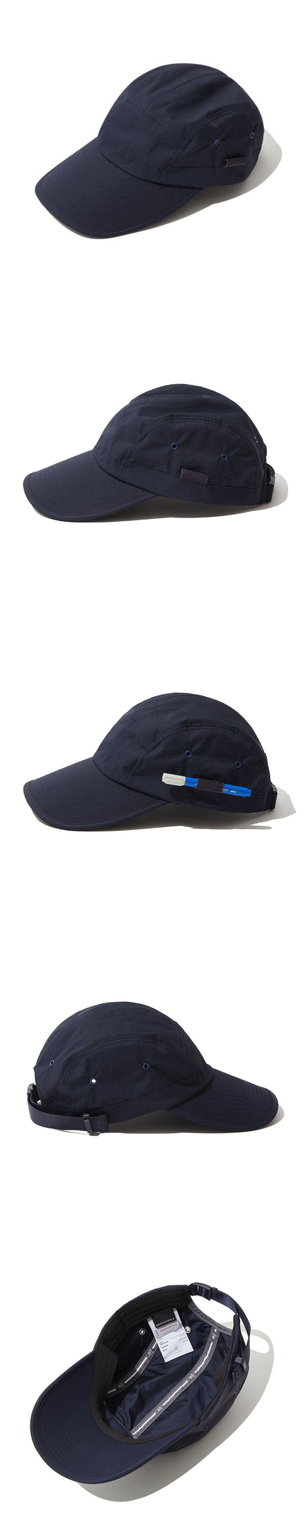 건축가의 모자라는 콘셉트로 시작하여 실용성, 내구성, 심미성 3가지 요소를 기반으로 제작한 캠프캡입니다. 좌측에는 자주 사용하는 펜을 꽂을 수 있는 밴드 홀더가 있고 사이즈 조절 방식의 경우 가방에 사용되던 부자재를 활용하여 모자에 적용하고자 하였습니다. 초발수 가공 및 래미네이팅 가공이 된 원단으로 일상생활 방수가 가능하지만 그에 따라 공기 순환성이 부족할 것으로 생각하여 아일렛으로 내부의 공기 배출을 보완한 디자인이며, 챙의 길이가 평균치보다 좀 더 긴 것이 특징입니다.