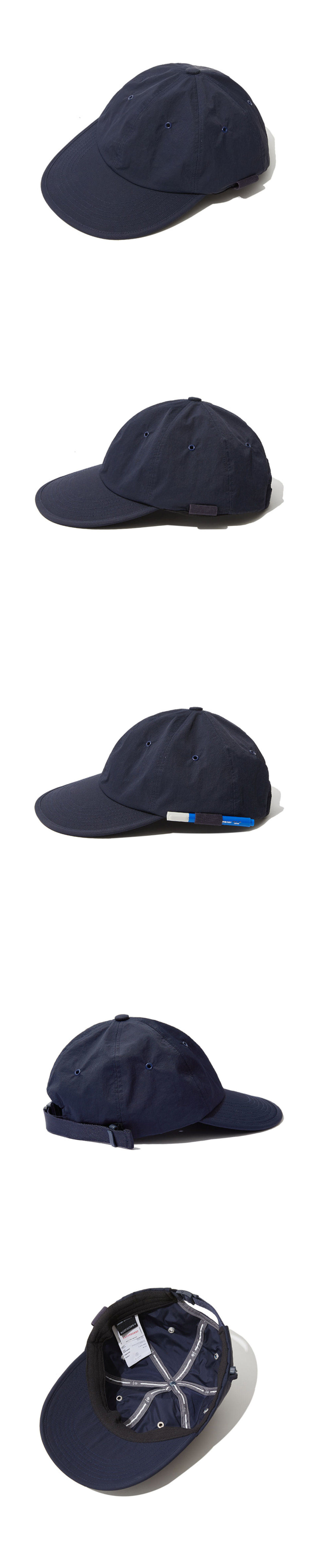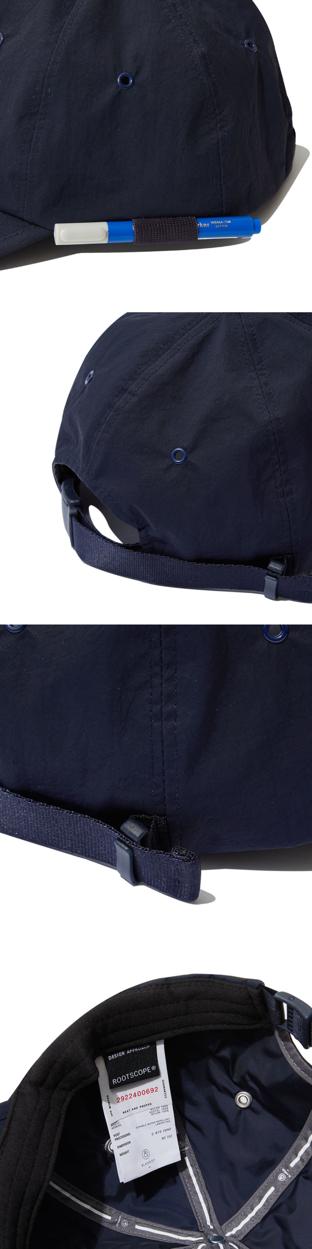 건축가의 모자라는 콘셉트로 시작하여 실용성, 내구성, 심미성 3가지 요소를 기반으로 제작한 볼캡입니다. 좌측에는 자주 사용하는 펜을 꽂을 수 있는 밴드 홀더가 있고 사이즈 조절 방식의 경우 가방에 사용되던 부자재를 활용하여 모자에 적용하고자 하였습니다. 초발수 가공 및 래미네이팅 가공이 된 원단으로 일상생활 방수가 가능하지만 그에 따라 공기 순환성이 부족할 것으로 생각하여 아일렛으로 내부의 공기 배출을 보완하였습니다.