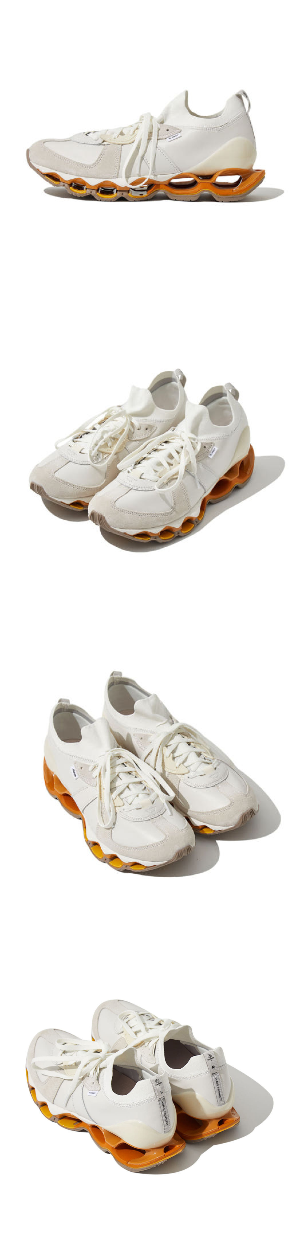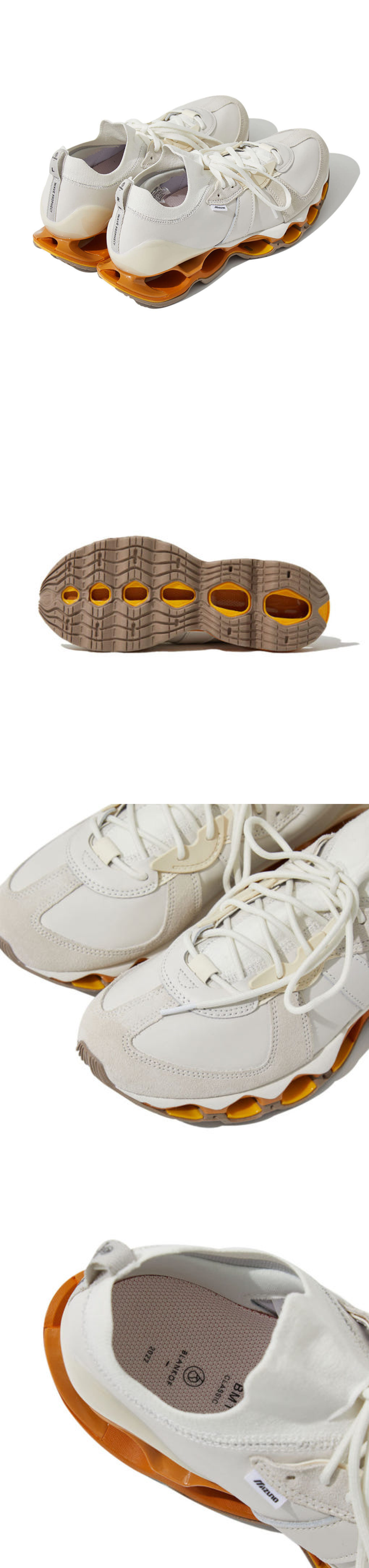 BM1 German Trainer (BM1 저먼 트레이너)는 올해 2022년에 미즈노에서 첫 선을 보인 Wave Prophecy β (웨이브 프로페시 베타)를 베이스로 디자인되었습니다. 웨이브 프로페시 베타는 발바닥 전체가 모두 미즈노의 테크놀로지가 적용된 Full-length Infinity Wave (풀 랭스 인피니트 웨이브)라는 점이 가장 큰 특징이며, 적용된 기술은 장시간 걸을 경우에도 편안한 착용감과 안정성을 느낄 수 있어 발의 피로감이 매우 적어 만족스러운 착용감을 경험할 수 있습니다. 신발 측면의 왼발과 오른발에는 미즈노와 블랭코브 라벨이 서로 각각 다르게 달려있으며 깔창에 표기된 브랜드 로고는 라벨에 명시된 브랜드명과 엇갈려 프린트 되어 있어 한 쪽의 신발만 보더라도 함께 협업한 디자인임을 직관적으로 알 수 있도록 했습니다.