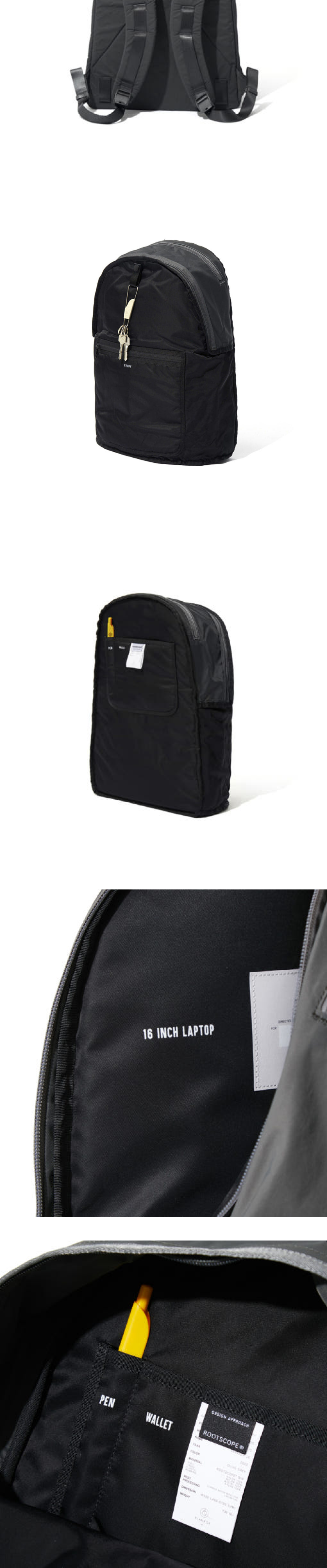 1일 치 용량의 수납이 가능하게 설계된 데이팩으로 내구성 및 유틸리티 기능을 강화하여 출시하였습니다. 랩톱 수납공간을 따로 분리하여 15인치 랩톱 PC도 여유롭게 보관할 수 있게 하였으며, 전면부 포켓은 목적에 따라 소지품 보관을 따로 분류할 수 있도록 양분화 하였습니다. 원단은 수년간 연구로 직접 개발하여 제작한 ROOTSCOPE® GIM 는 솔라 트윌 조직의 나일론 원단으로 바스락 거리는 터치감과 가볍지만 견고한 것이 특징입니다. DWR 가공과 래미네이팅 후가공된 3 Layer 원단 및 YKK® AquaGuard 지퍼를 사용하여 생활 발수 및 방수에 알맞게 제작되었습니다. * 가방이 무거워져도 견고함을 더해주는 체스트 스트랩과 싱글 웹 스트랩 제품과 같이 사용할 수 있습니다. (별도 구매)