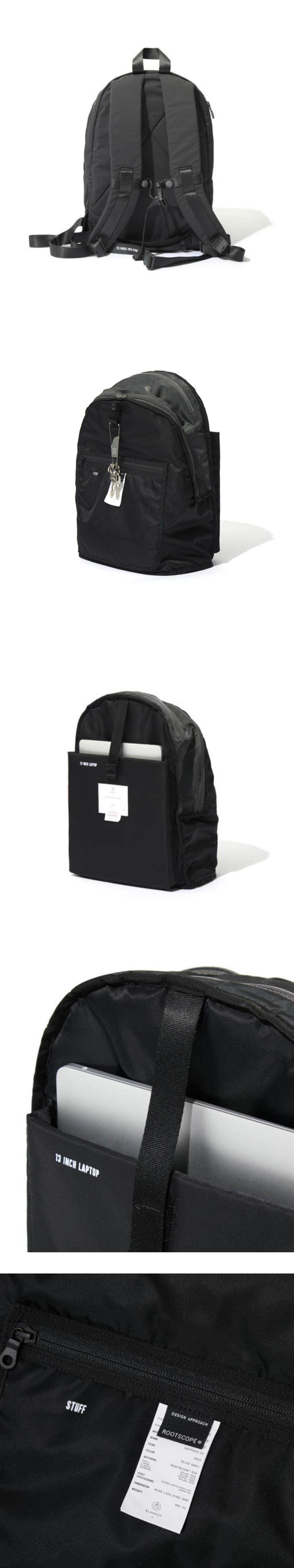 미니멀한 디자인과 더불어 박스로고 스티치를 더해 담백함을 더했습니다. 가볍게 가지고 다니기 좋은 사이즈와 중량으로 편안한 착용감의 어깨 패드와 어깨끈 길이 조정 후 더욱 견고하게 잡아주는 커브드 캠을 사용했습니다. 빠르게 물건을 꺼낼 수 있는 별도의 상단 지퍼와 오토락 YKK 방수 지퍼를 사용하여 쉽게 가방이 열려 물건이 쏟아지는 일이 없도록 제작했습니다. 가방 내부에는 전자기기를 안전하게 수납한 패드 주머니와 작은 파우치, 모자 등을 걸어서 보관할 수 있도록 상단 고리를 더했습니다. 원단은 수년간 연구로 직접 개발하여 제작한 ROOTSCOPE® GIM 는 솔라 트윌 조직의 나일론 원단으로 바스락 거리는 터치감과 가볍지만 견고한 것이 특징입니다. DWR 가공과 래미네이팅 후가공된 3 Layer 원단 및 YKK® AquaGuard 지퍼를 사용하여 생활 발수 및 방수에 알맞게 제작되었습니다.