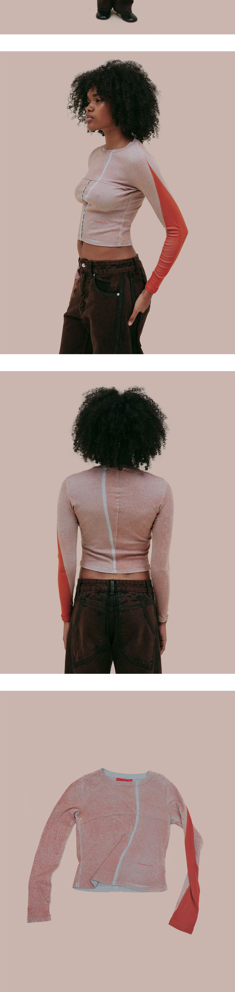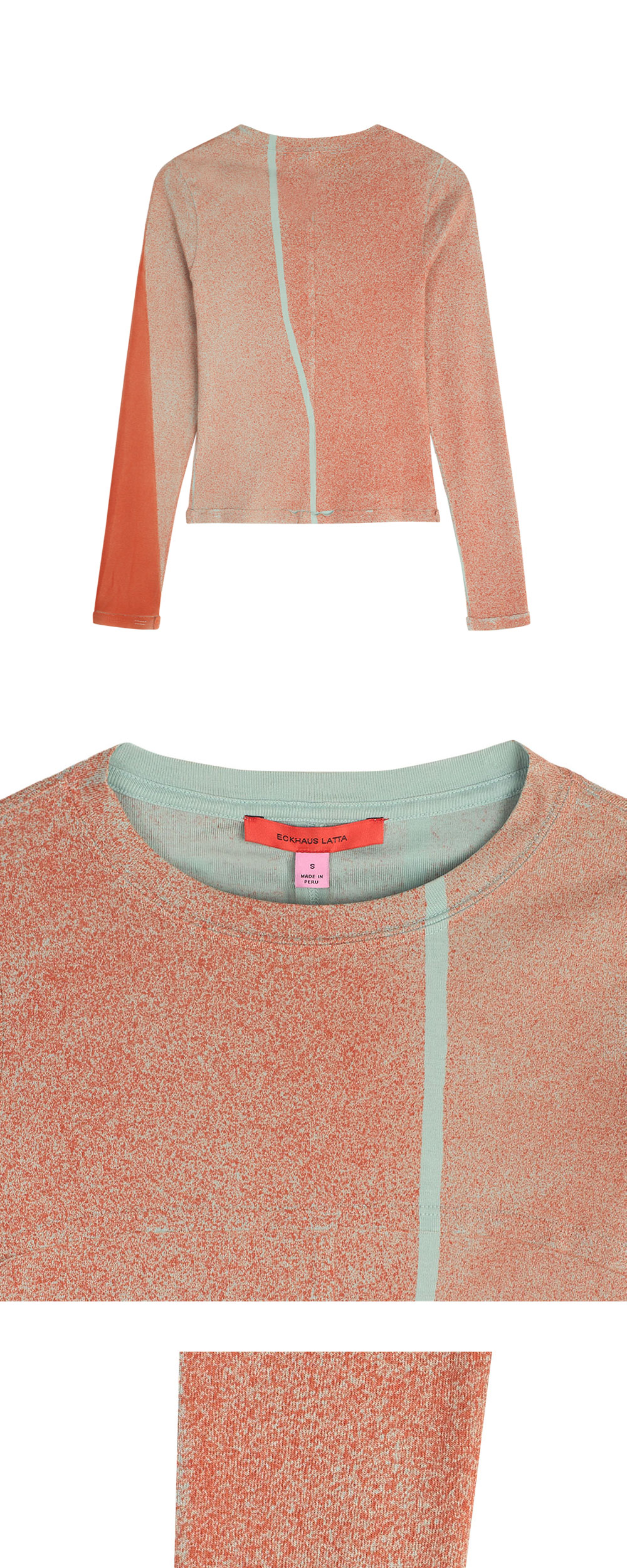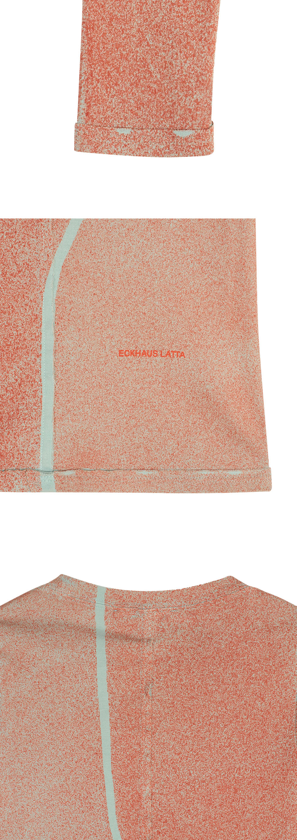 스프레이와 절개의 레드 디테일이 매력적인 에크하우스 라타의 우먼 랩 베이비 크루넥 엠버입니다. - 클래식한 랩 디테일 - 주황색 로고 스크린 프린팅 - 크루넥