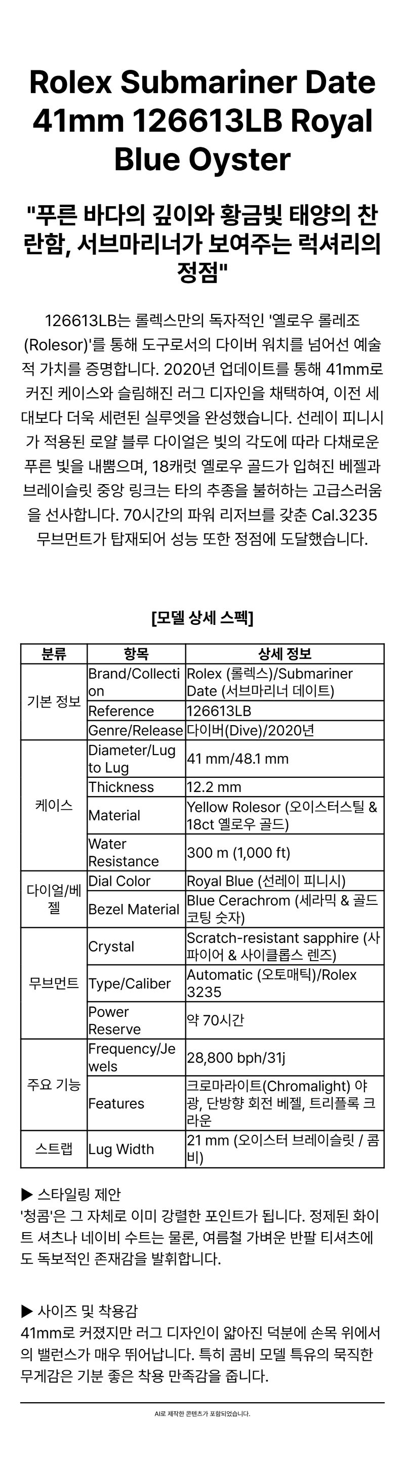 롤렉스 서브마리너 데이트 41mm 126613LB 로얄 블루 오이스터
