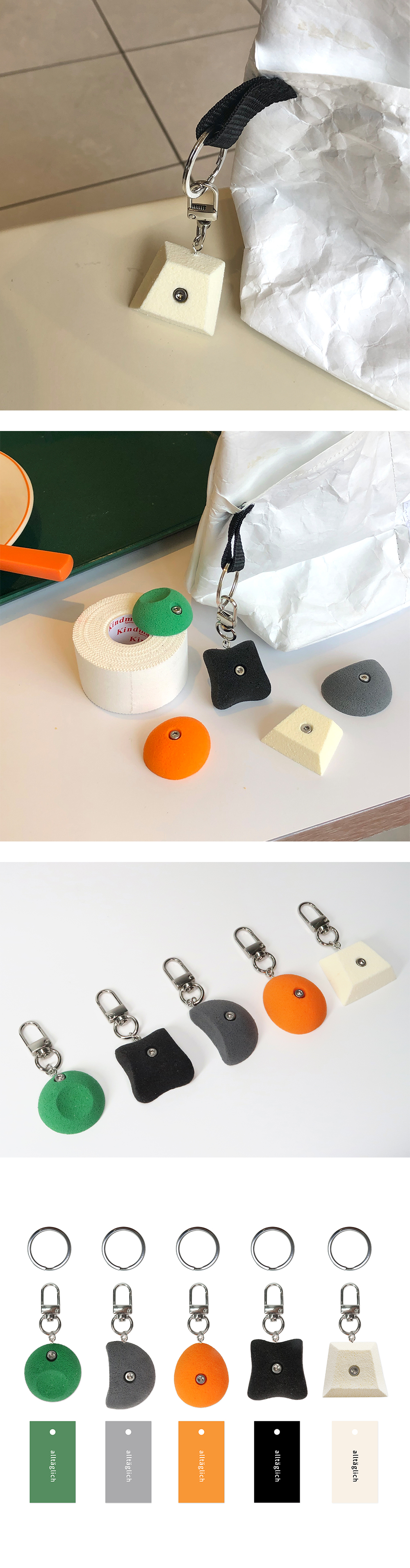 알테그리히가 선보이는 제품인 ‘클라이밍 홀드 키링’은 클라이밍 홀드를 작은 사이즈로 제작하여 일상 속에서 귀엽게 들고다닐 수 있도록 출시되었습니다. 알테그리히의 홀드 키링은 실제 홀드와 동일한 소재로 같은 공정을 통하여 일상 속에서도 홀드 촉감을 직접적으로 느낄 수 있게 만들었습니다.