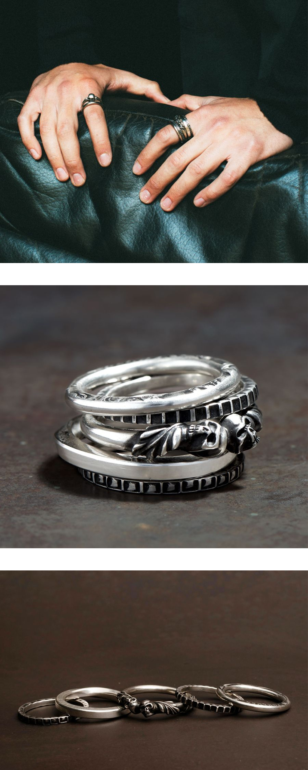 서로 다른 다섯 개의 링으로 구성된 베르크슈타트 뮌헨 5 링 콤비네이션 스컬입니다. - 개별적인 역동성과 완벽한 핏을 위해 표시된 순서대로 착용 - 아래쪽 반지는 조합이 하나처럼 보이도록 느슨함 - 작은 두개골과 잎 조각