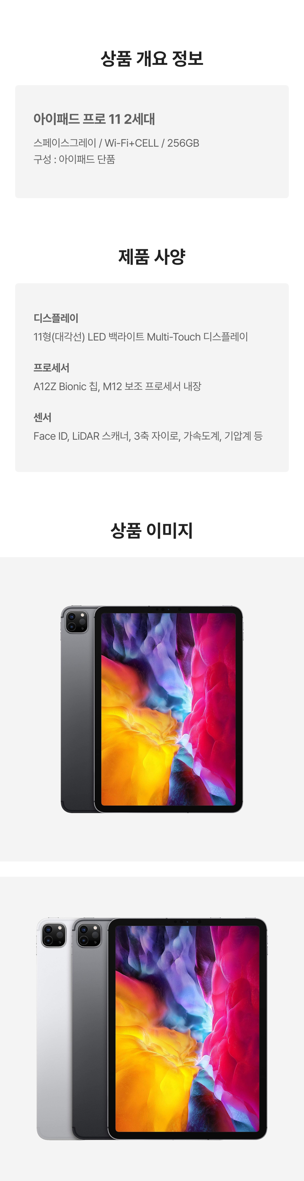 [B등급] 리퍼비시 아이패드 프로 11 2세대 wifi+cellular A12Z Bionic 256기가 스페이스그레이