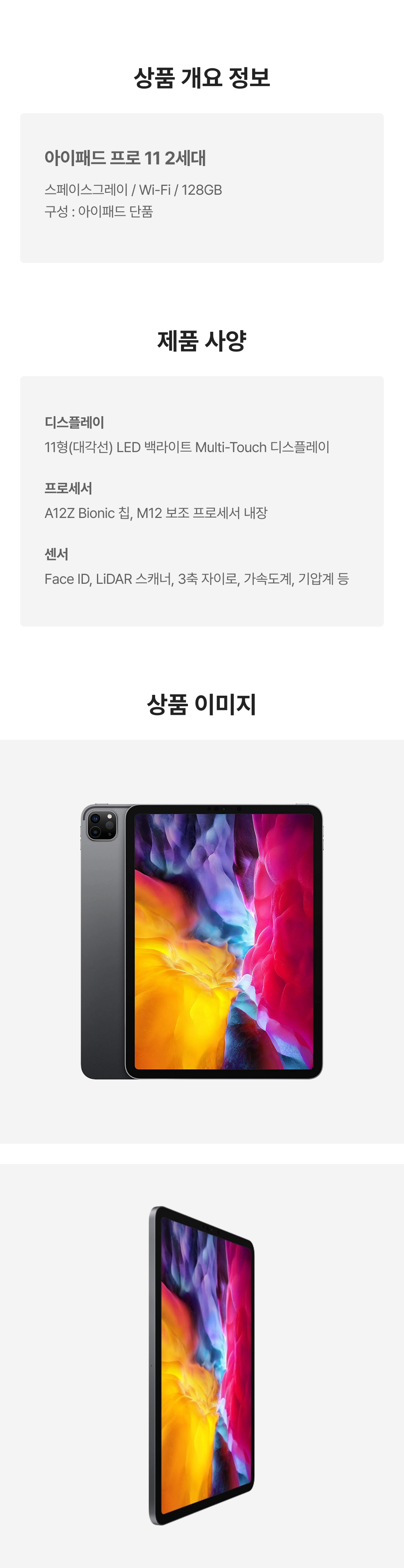 [B등급] 리퍼비시 아이패드 프로 11 2세대 wifi A12Z Bionic 128기가 스페이스그레이
