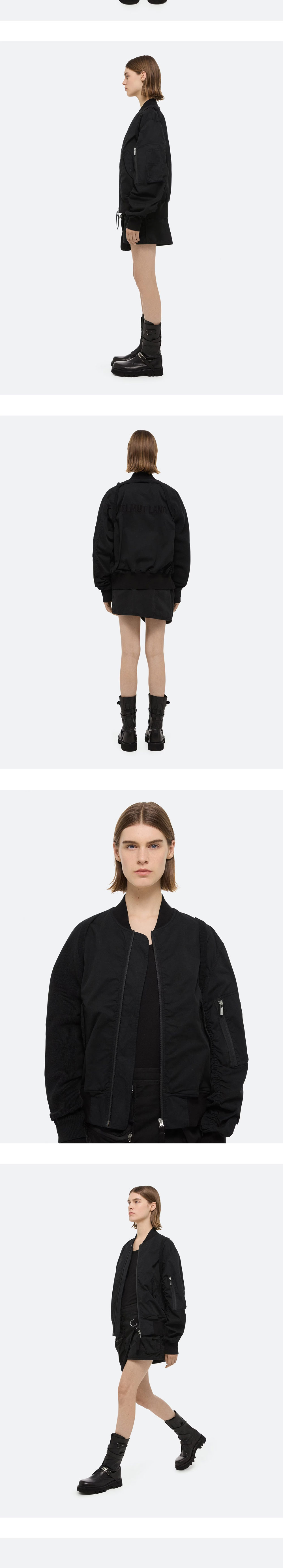 가벼운 면 트윌 소재의 클래식한 매력을 가진 헬무트 랭의 우먼 MA1 봄버 블랙입니다. - 양방향 지퍼 전면 잠금 - 리브 스탠드 칼라, 밑단, 그리고 커프스 - 벨트 디테일이 있는 리브 니트의 탈착식 슬리브 - 허리 부분의 스냅 포켓 - 양방향 지퍼 - 뒷면의 톤 자수 로고 - 경량 충전재 - 릴렉스 핏 - 후면에 HL 로고