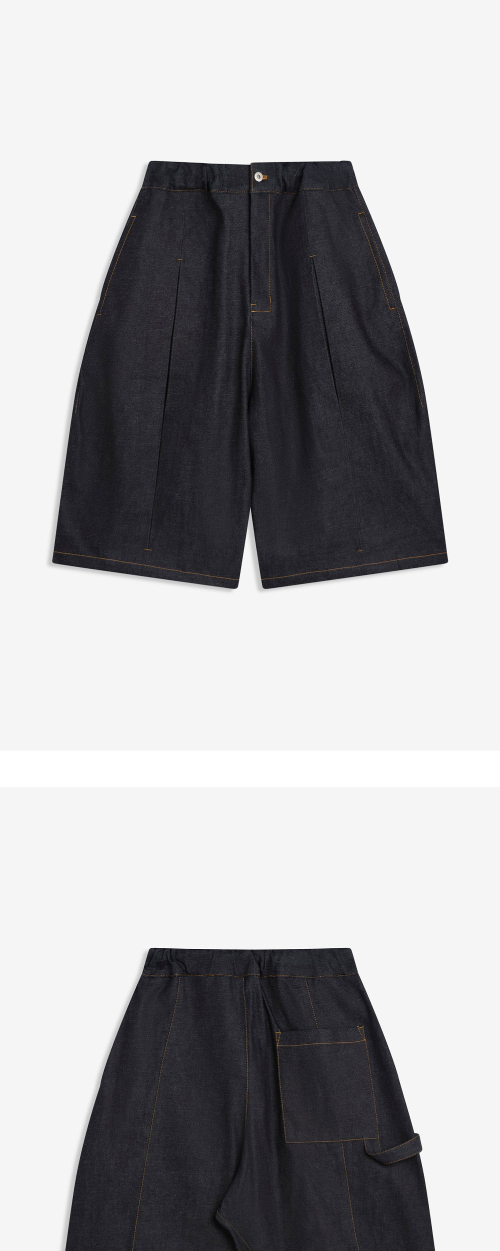 후면의 포켓 포인트가 매력적인 세이지 네이션의 박스 플리츠 쇼츠 로우 데님입니다. - 중앙 박스 주름 - 허리 밴딩 - YKK 지퍼 - 후면 패치 포켓 - 100% 생면 데님 - 일본 코지마 제작