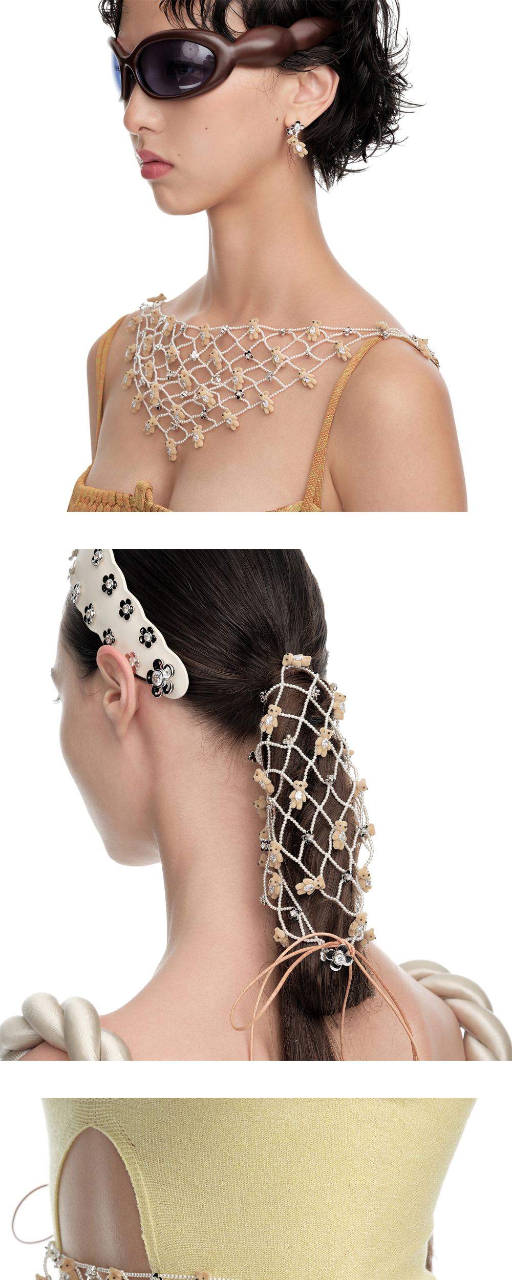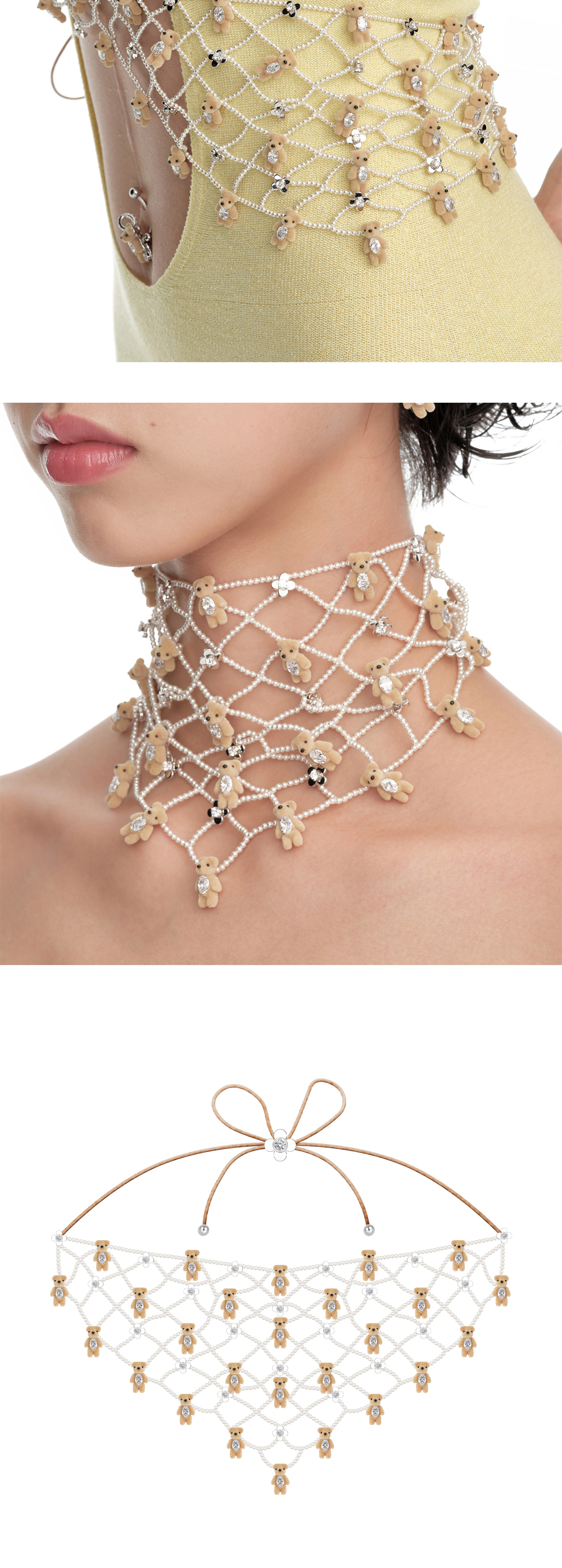 여러 개의 곰돌이로 장식된 위민의 미니 베어 바부쉬카 네클리스입니다. - "보석에 새긴 옷감"의 의미를 담은 Paradise 컬렉션 - 지르콘 보석을 품은 곰돌이 - 펄 스트랩과 꽃 팬던트 - 다양하게 활용 가능