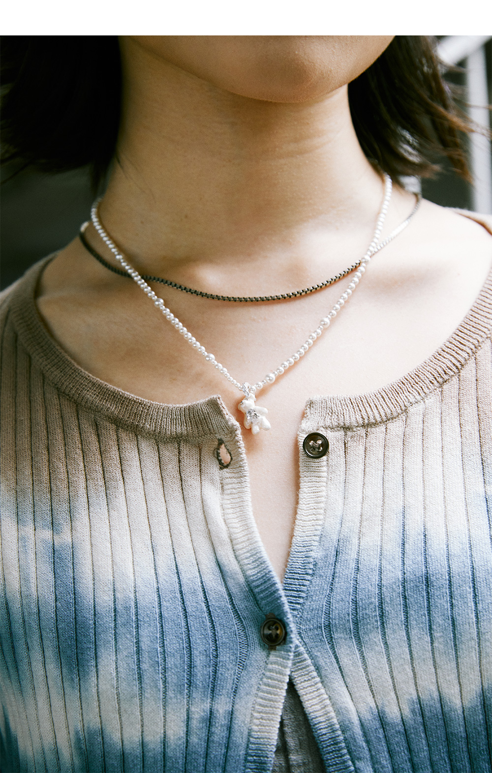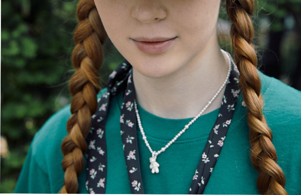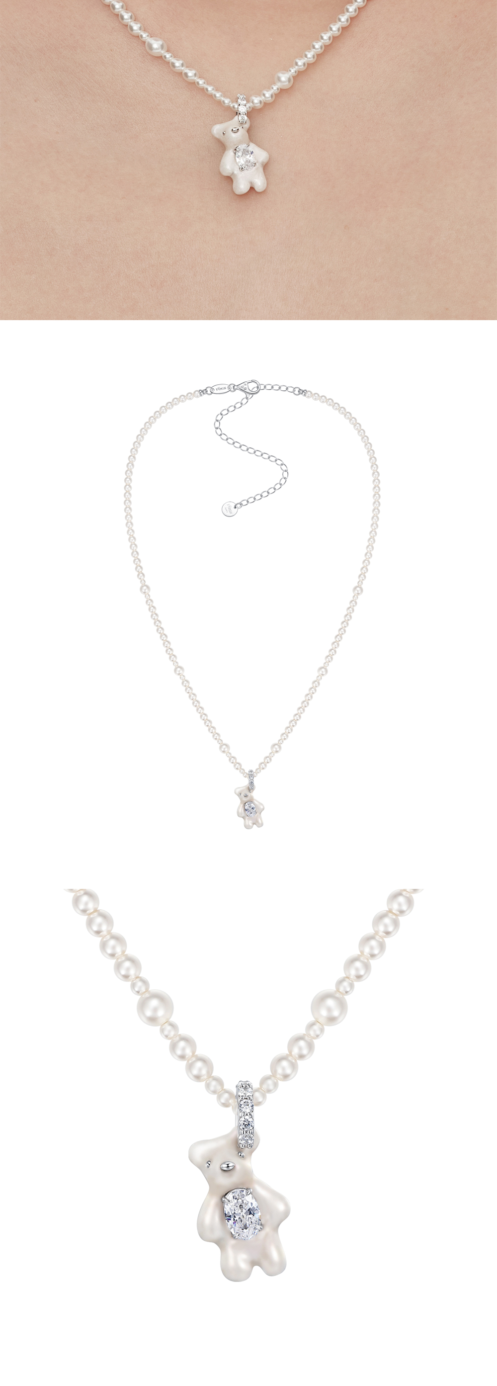 위민의 시그니처 베어가 진주로 탄생한 위민의 미니 베어 펄 그라디언트 컬러 네클리스입니다. - "보석에 새긴 옷감"의 의미를 담은 Paradise 컬렉션 - 펄 스트랩 - 지르콘 보석을 품은 베어 * 곰 길이: 1.9cm, 너비: 1.1cm * 체인 길이: 35cm+10cm 연장 체인 * 무게: 9.1g