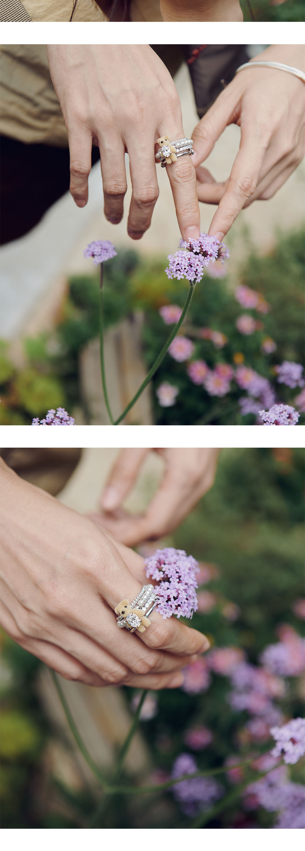 화이트 지르콘 보석을 가슴에 품고 있는 곰돌이가 장식된 밴드 링입니다. - "보석에 새긴 옷감"의 의미를 담은 Paradise 컬렉션 - 브라운 컬러의 곰돌이 인형 - 4개의 링을 레이어링한 형태의 디자인 | 사이즈 가이드 | - HK 사이즈 - 무게 7.9g