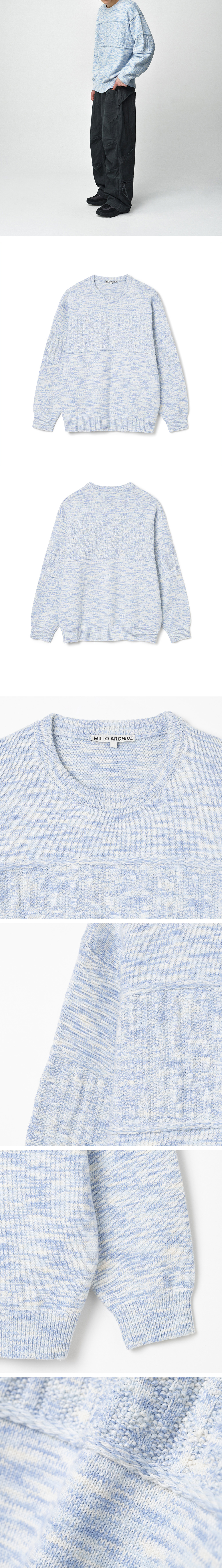 - 오버 실루엣 베이스의 크롭한 기장감으로 트렌드한 무드를 보여주는 라운드 니트 - 대각선으로 이어지는 연속적인 라인 베이스로 스퀘어 조직감이 돋보임 - 원단 조직 형태로 인해 시원한 시각적 느낌을 줌 - 코튼, 나일론, 린넨 혼방 원사 사용하여 계절감에 무관 오래 착용 가능 - 밀로 아카이브만의 브랜드 무드를 보여주는 스카시 조직 개발 적용 - 하의에 구분 없이 착용 가능한 베이직 컬러로 발매