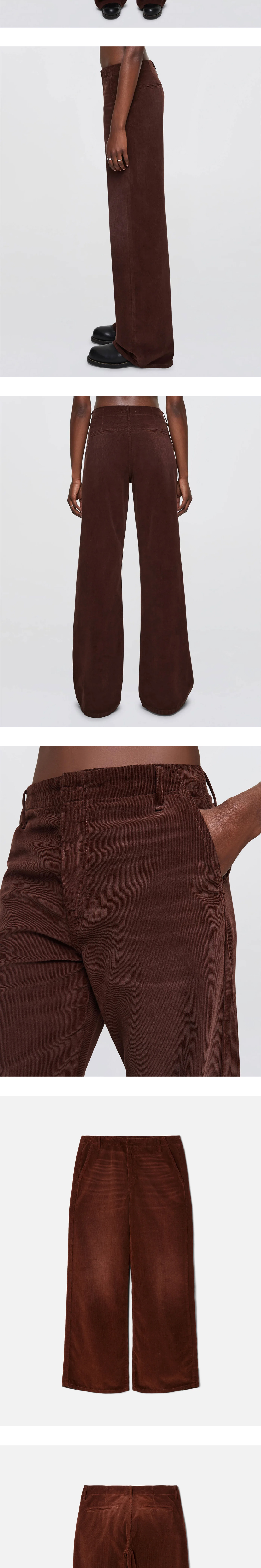 다크 초콜릿 컬러를 지닌 리던의 우먼 코드 트라우저입니다. - 최신 실루엣 - 낮은 라이즈와 헐렁한 핏이 특징 - 정통 빈티지 느낌의 워싱 다운 코듀로이 원단으로 제작 * 모델 25 사이즈 착용 / 평소 사이즈 25