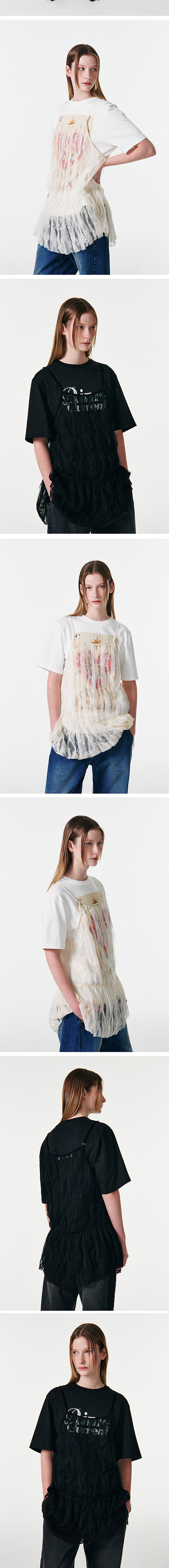 OUTSHELL - POLYASTER 70% NYLON 30% - 가볍고 하늘하늘한 시스루 텍스처로 세련된 룩을 완성시켜주는 아이템 - 단독 혹는 다양한 이너 탑과 함께 스타일링 하기 좋은 제품 - 플라워 모티브의 레이스에 헤어리한 텍스쳐를 더한 페미니한 룩 - 오버핏 코디에 레이어드 매치하여 스타일리시한 분위기 연출 F 총장 40 / 23.5 가슴 48 밑단 76 목넓이 21