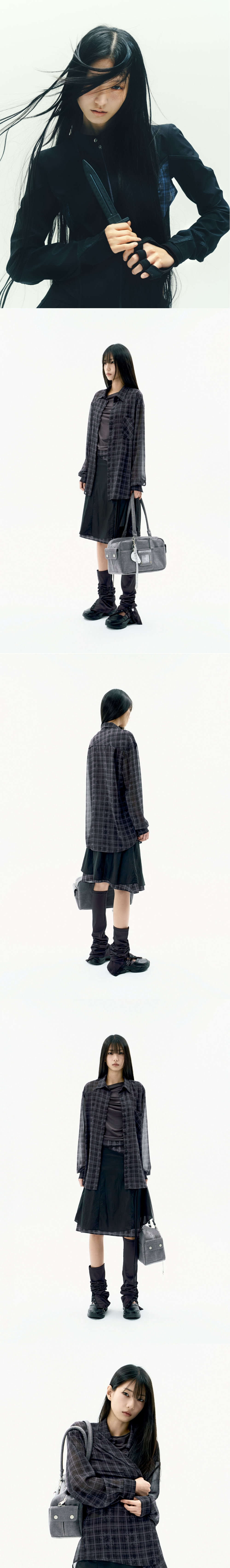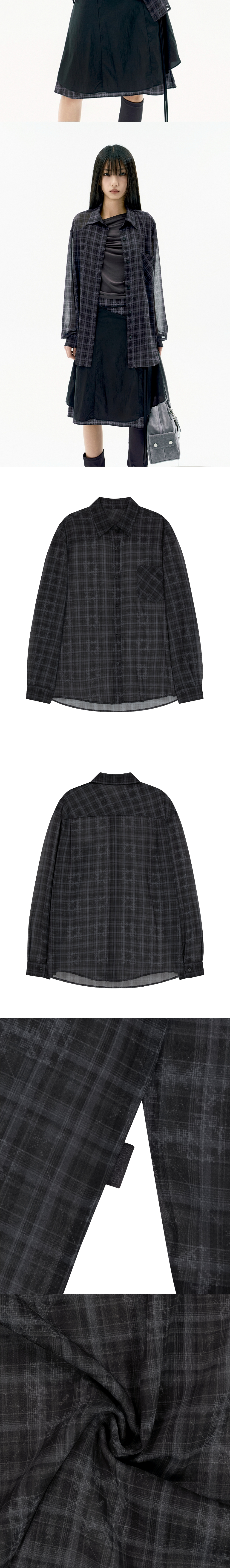 OJOS 체크 패턴을 사용한 쉬어 셔츠 | 오버 핏 | 뒷면 중앙 핀턱 디테일로 활동성 우수 | 전면 가슴 포켓 | 투명한 쉬어 소재로 한 여름에도 쾌적한 착용감 | 측면 오호스 폴딩 라벨 디테일 Model is 168cm and wears size OS.