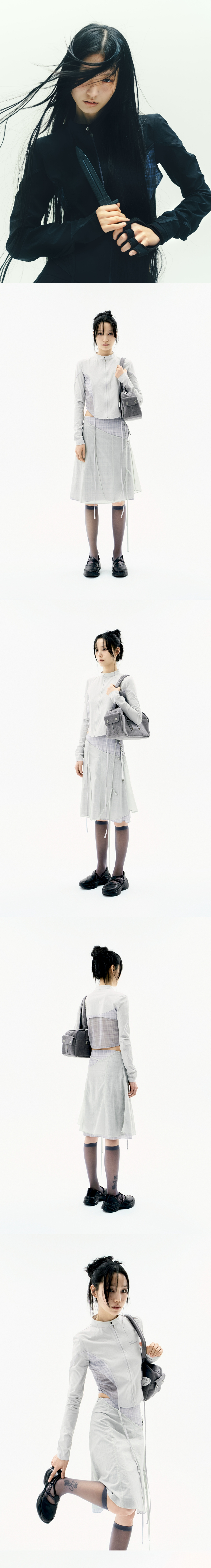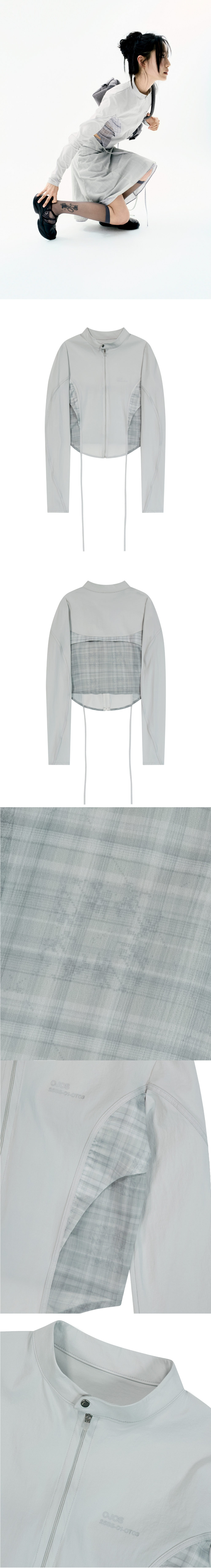 시원한 터치감의 크롭 집업 셔츠 | 슬림 핏 | 전면 OJOS 시즌 넘버 전사 | 2way 스트레치 원단 사용 | 2가지 텍스처 배색 디테일 | OJOS 체크원단 사용 | 전면 스트랩을 활용하여 다양한 스타일링 가능 | 독특한 소매 절개라인 | 커브드 헴라인 | 전면에 YKK 1way 지퍼 및 풀러 마감 * 동시즌 [Layered Strap Flare Skirt]과 셋업 아이템 * Model is 168cm and wears size 1.