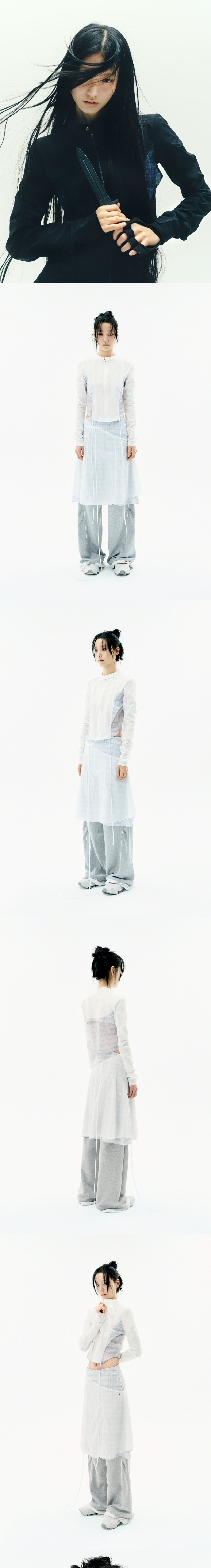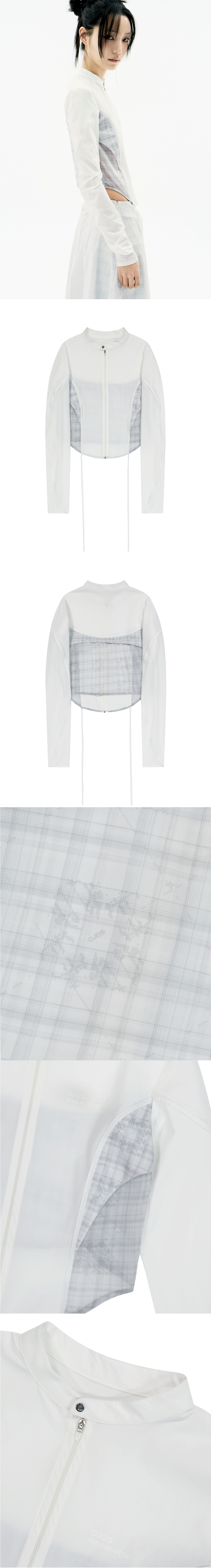 시원한 터치감의 크롭 집업 셔츠 | 슬림 핏 | 전면 OJOS 시즌 넘버 전사 | 2way 스트레치 원단 사용 | 2가지 텍스처 배색 디테일 | OJOS 체크원단 사용 | 전면 스트랩을 활용하여 다양한 스타일링 가능 | 독특한 소매 절개라인 | 커브드 헴라인 | 전면에 YKK 1way 지퍼 및 풀러 마감 * 동시즌 [Layered Strap Flare Skirt]과 셋업 아이템 * Model is 168cm and wears size 2.