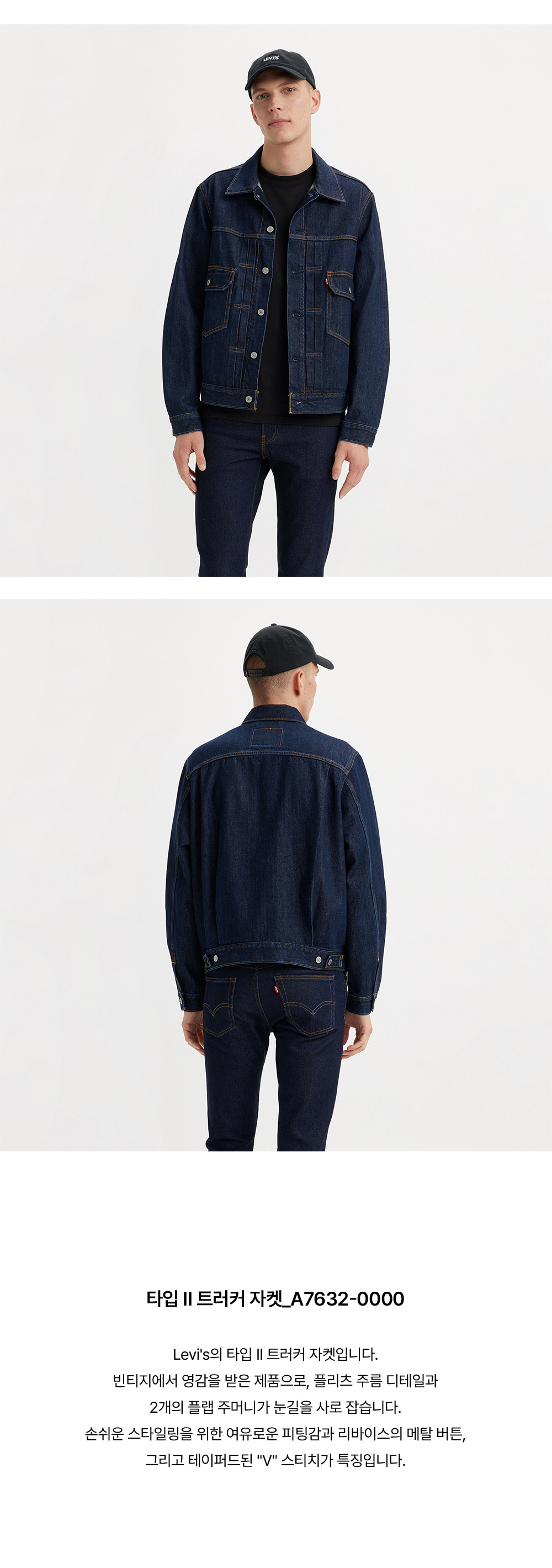 Levi's의 타입 II 트러커 자켓입니다. 빈티지에서 영감을 받은 제품으로, 플리츠 주름 디테일과 2개의 플랩 주머니가 눈길을 사로 잡습니다. 손쉬운 스타일링을 위한 여유로운 피팅감과 리바이스의 메탈 버튼, 그리고 테이퍼드된 "V" 스티치가 특징입니다.