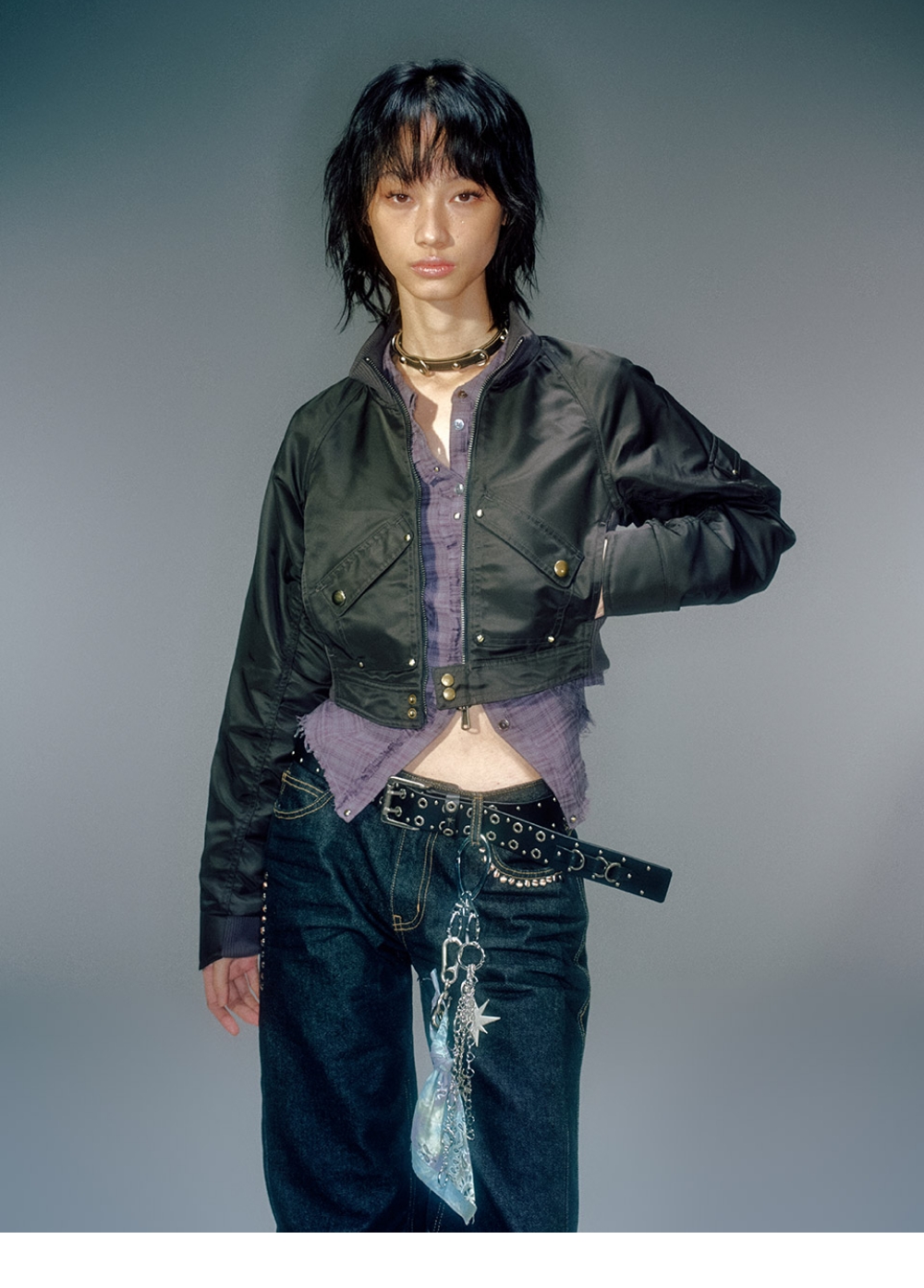 크롭한 기장감의 홀겹 점퍼 베이컨트 제작 YKK 2WAY 지퍼 사용 비정형 포켓 디테일 시보리 원단의 배색으로 인한 슬림핏 연출