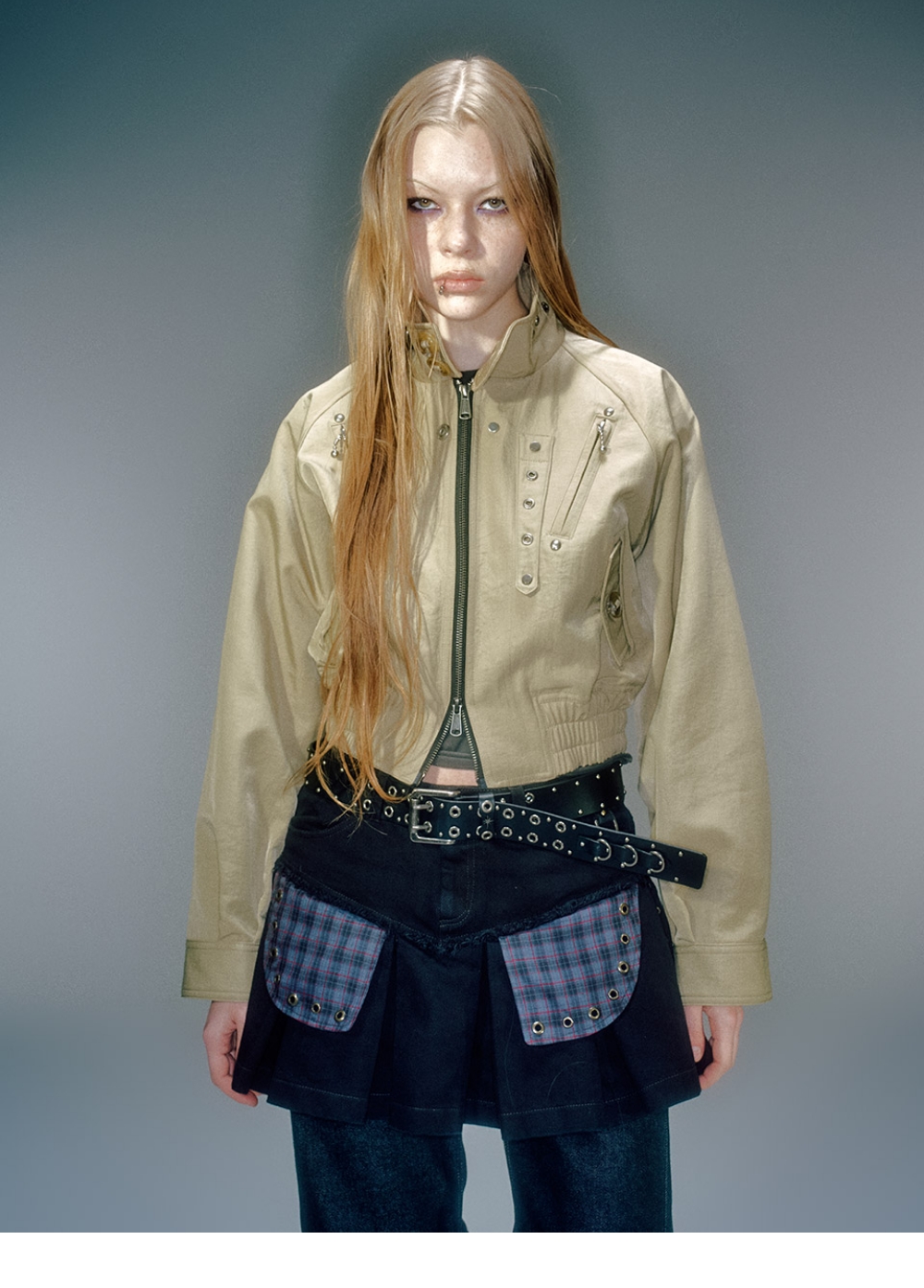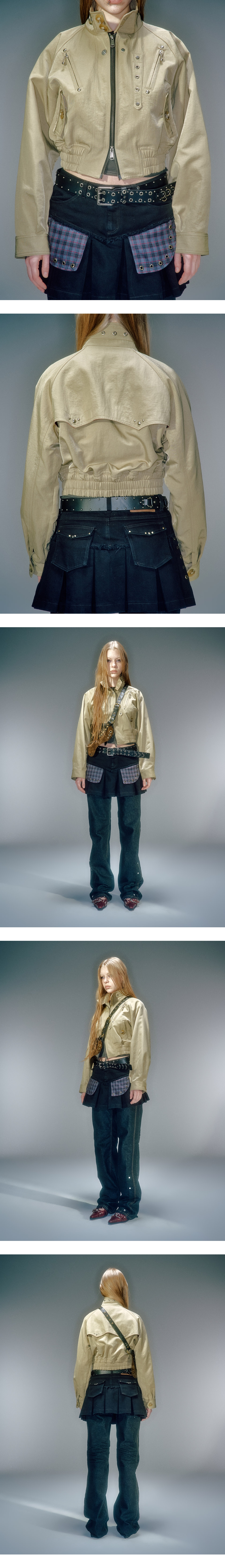 베이컨트 제작 스냅 사용 YKK 지퍼 사용 넉넉하지만 크롭한 실루엣 연춡 전면부 비죠 디테일 넥 안쪽 부분 시보리 덧댐으로 편안한 착용감